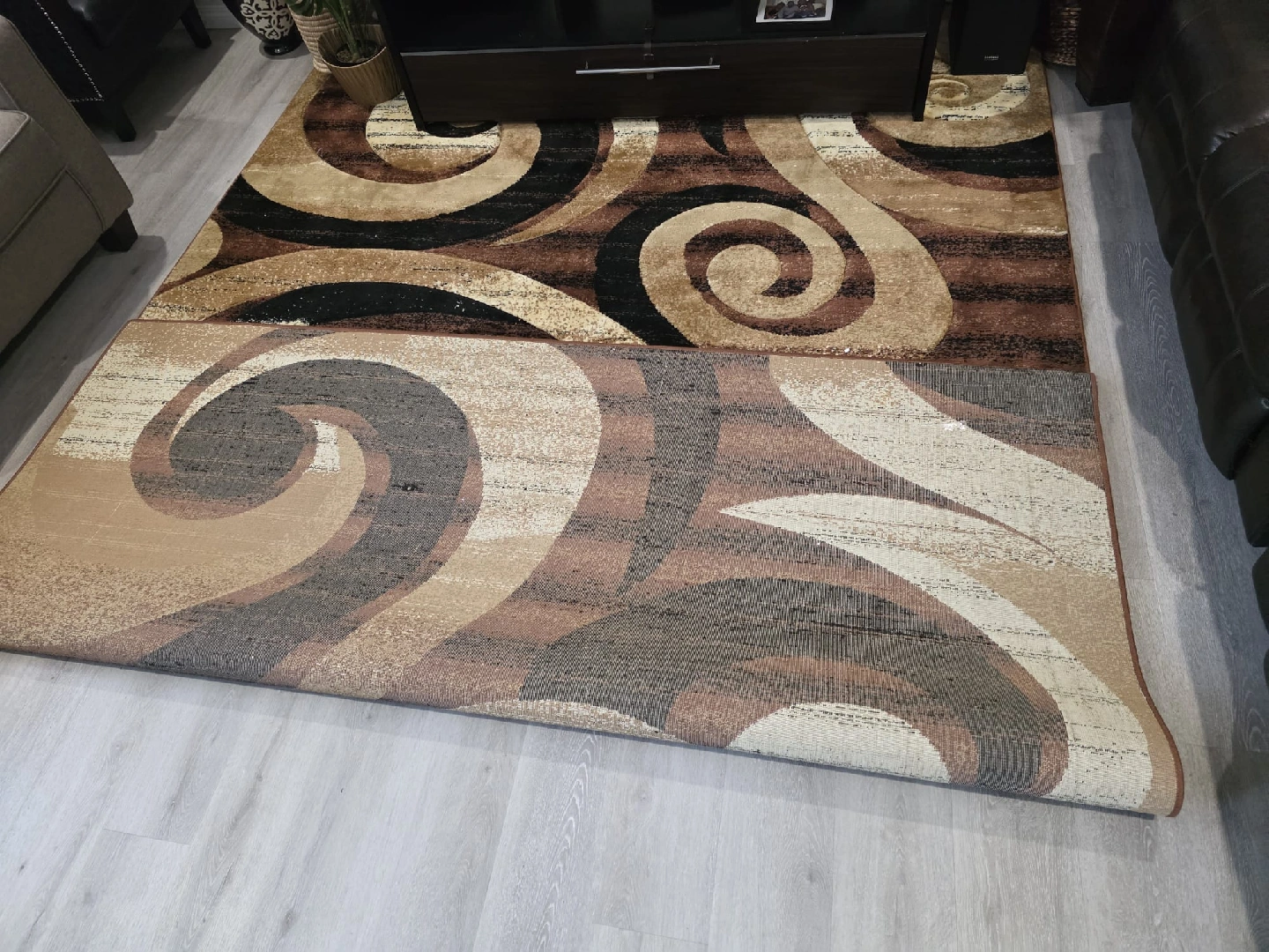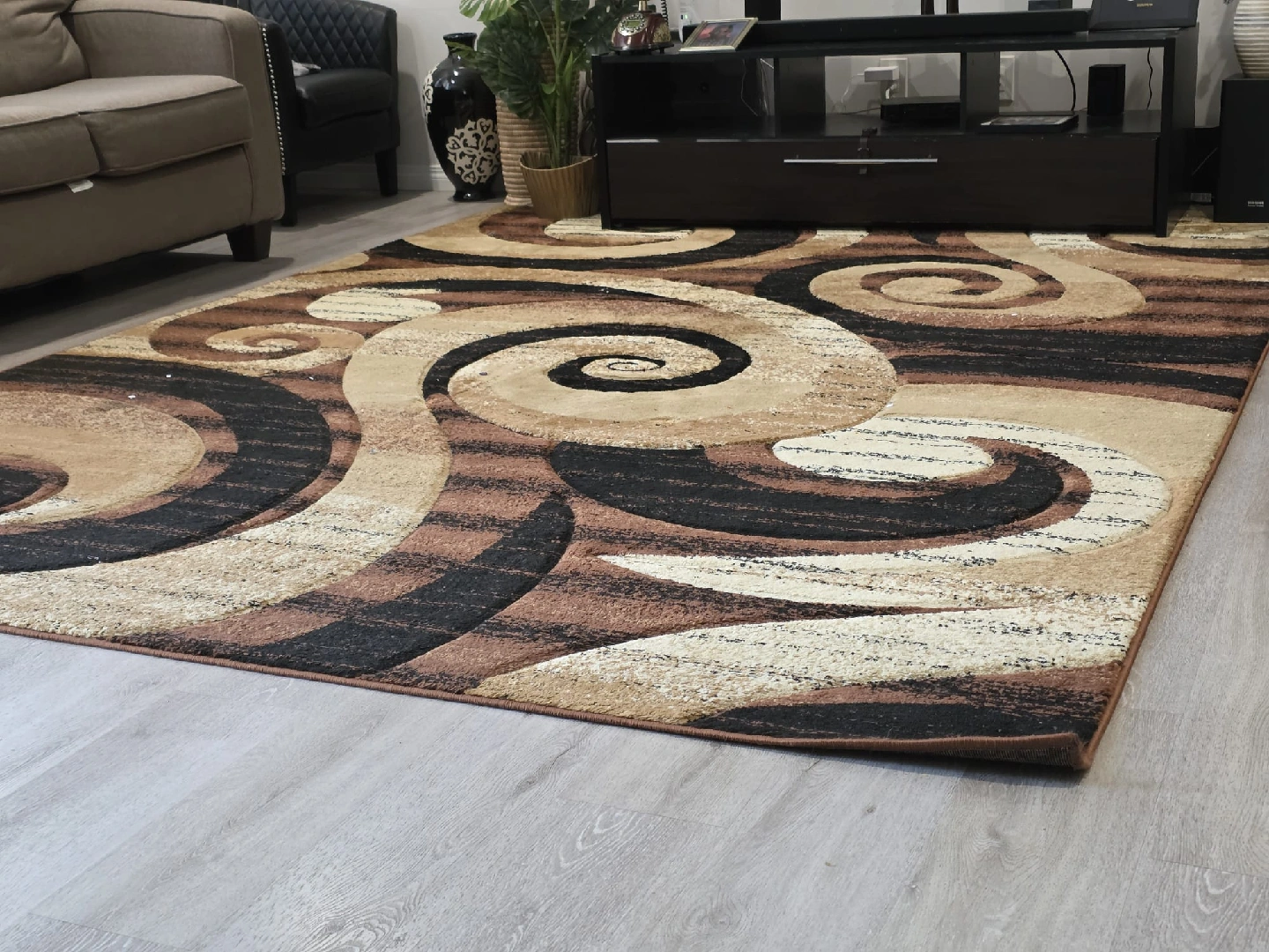 Area rug with a swirl pattern in shades of brown, black, and beige. It's in great condition and would look great in any living room or bedroom