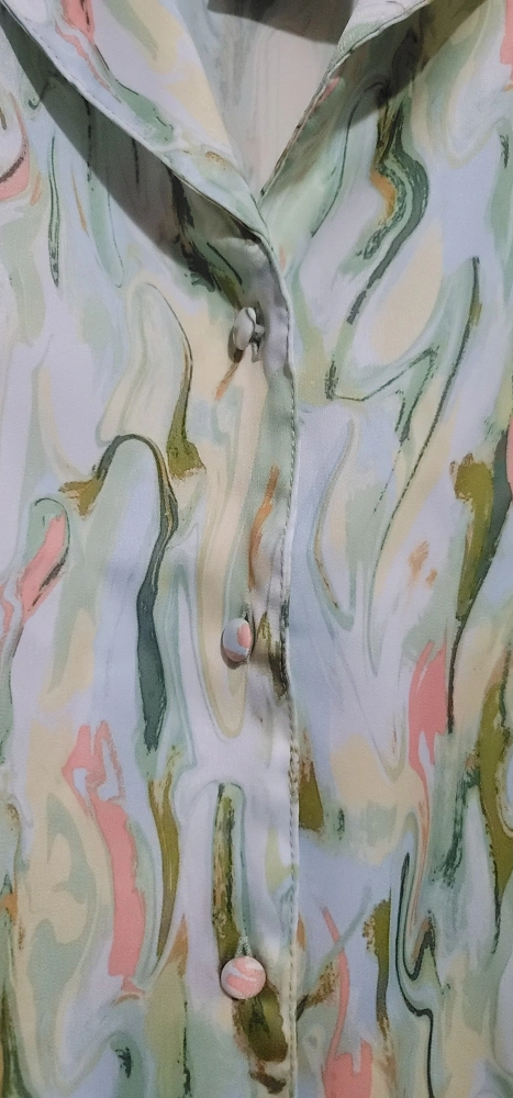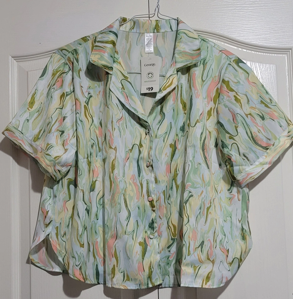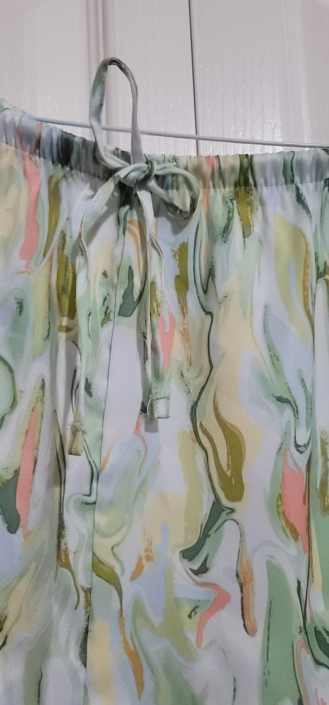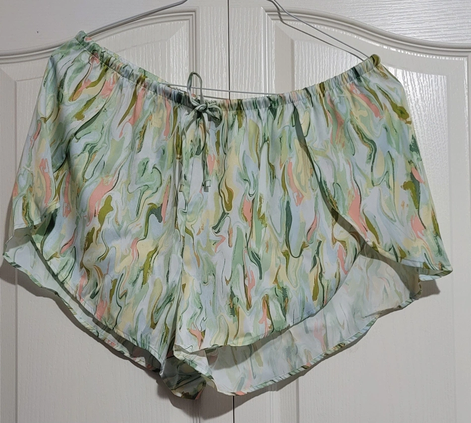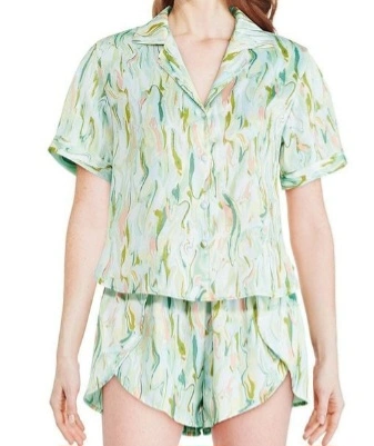 The set includes a pair of shorts and a matching top. The pattern is a really pretty mix of greens, yellows, and pinks. Perfect for a comfy night's sleep!