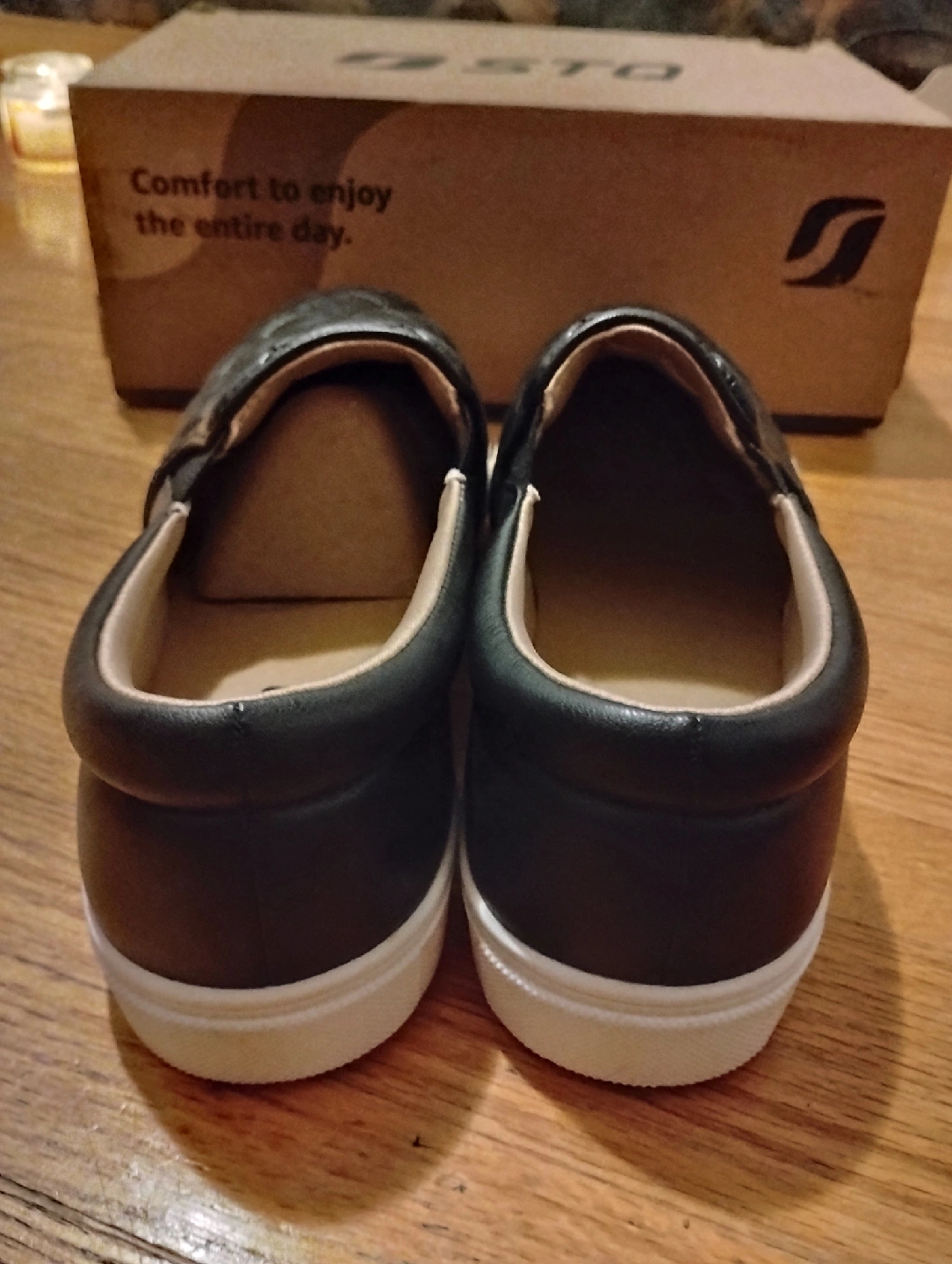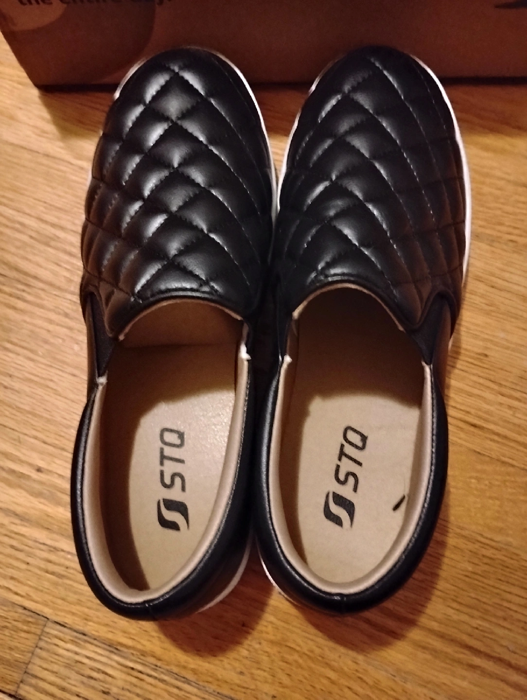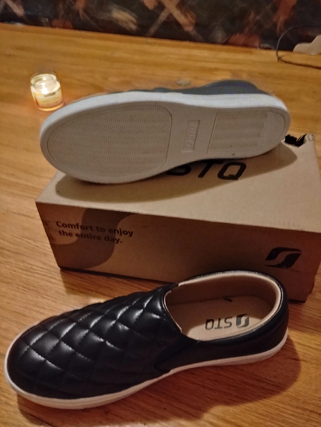 65Selling a pair of STQ black quilted slip-on sneakers! They are in great condition and come with the original box. These shoes are perfect for everyday wear, offering both comfort and style. They’re easy to slip on and off, making them super convenient. The quilted design adds a touch of elegance to these casual shoes