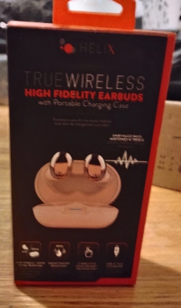 65Selling a new pair of Helix True Wireless High Fidelity Earbuds! They come with a portable charging case and are sweat-resistant. The earbuds feature capacitive touch-sense technology and use USB-C for charging. Box is included