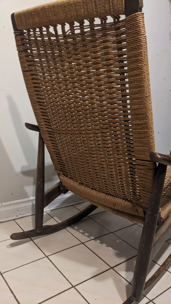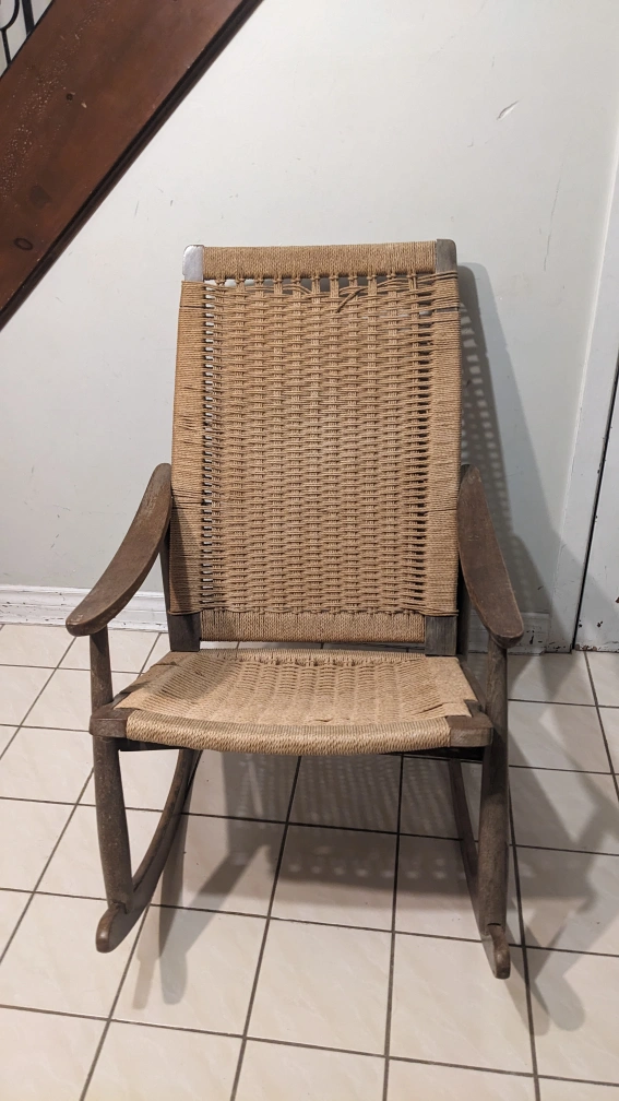 Selling a charming woven rocking chair. It has a lovely woven seat and back, perfect for relaxing. It has some signs of use, but it's still a comfortable and stylish piece for any home