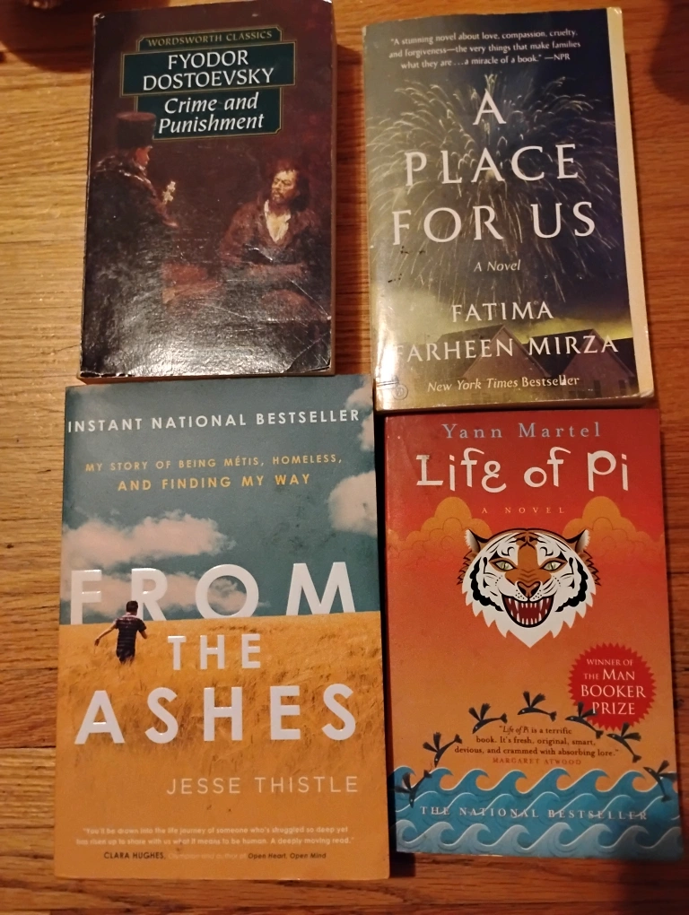 65$5 each - Crime and Punishment by Fyodor Dostoevsky - Life of Pi by Yann Martel - From the Ashes by Jesse Thistle - A Place For Us by Fatima Farheen Mirza