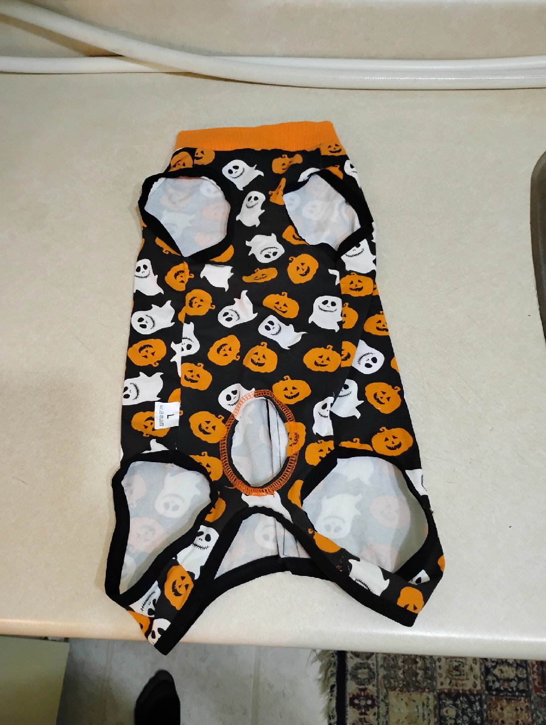A cute Halloween dog costume, perfect for your furry friend! It features a fun pumpkin and ghost pattern in black, orange, and white. Size large but really fits medium dogs.