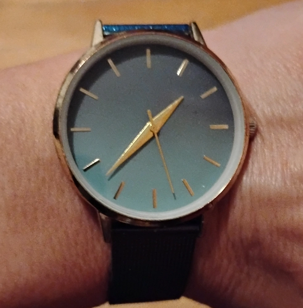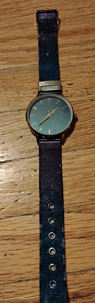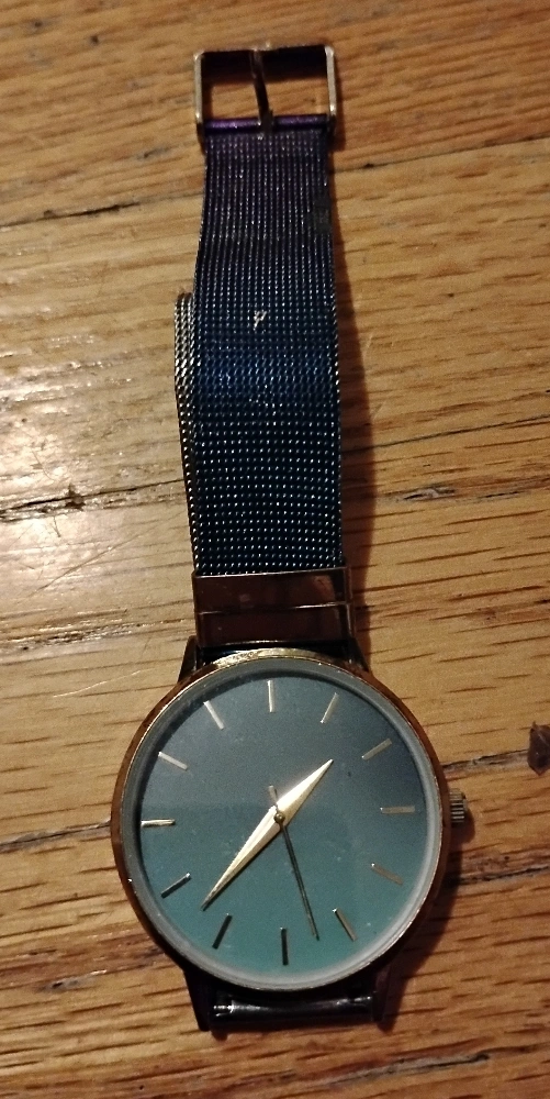 65A nice fashion watch with a blue and gold colour scheme. The band is a dark blue mesh, and the watch face is a gradient from blue to light blue. The hands are gold coloured as well