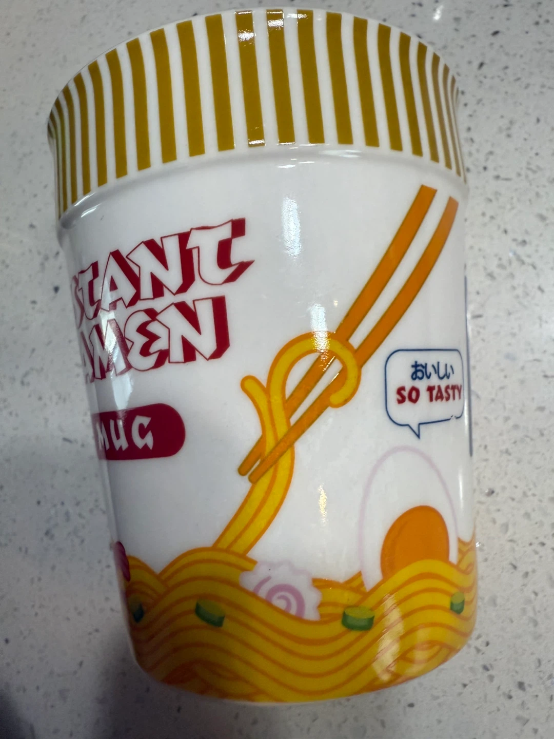 I'm selling a Paladone Instant Ramen Mug! It's a super cute mug that looks like a cup of instant noodles. It says "So Tasty!" on the side and is suitable for dishwasher and microwave use. It's in great condition and ready for a new home