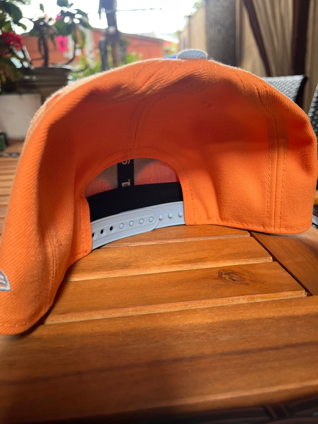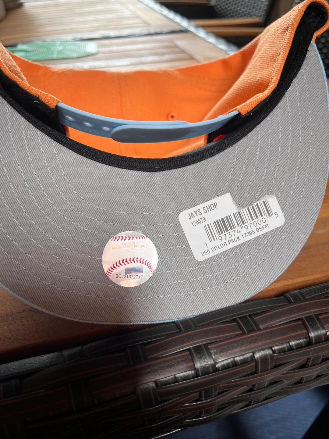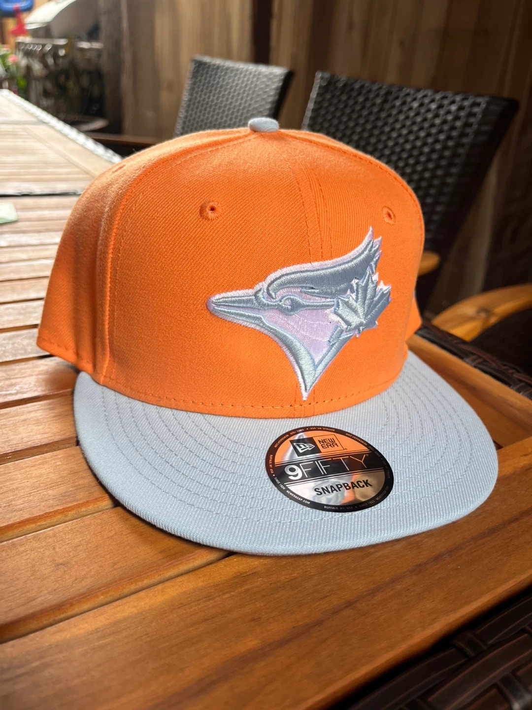 Selling a Toronto Blue Jays New Era 9FIFTY snapback hat. It's in great condition and features the team logo. The hat is orange with a light blue brim. Perfect for any Blue Jays fan!