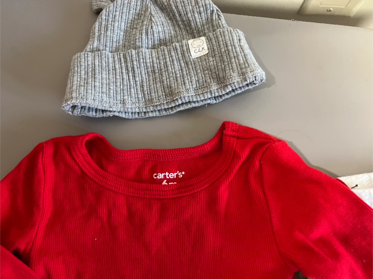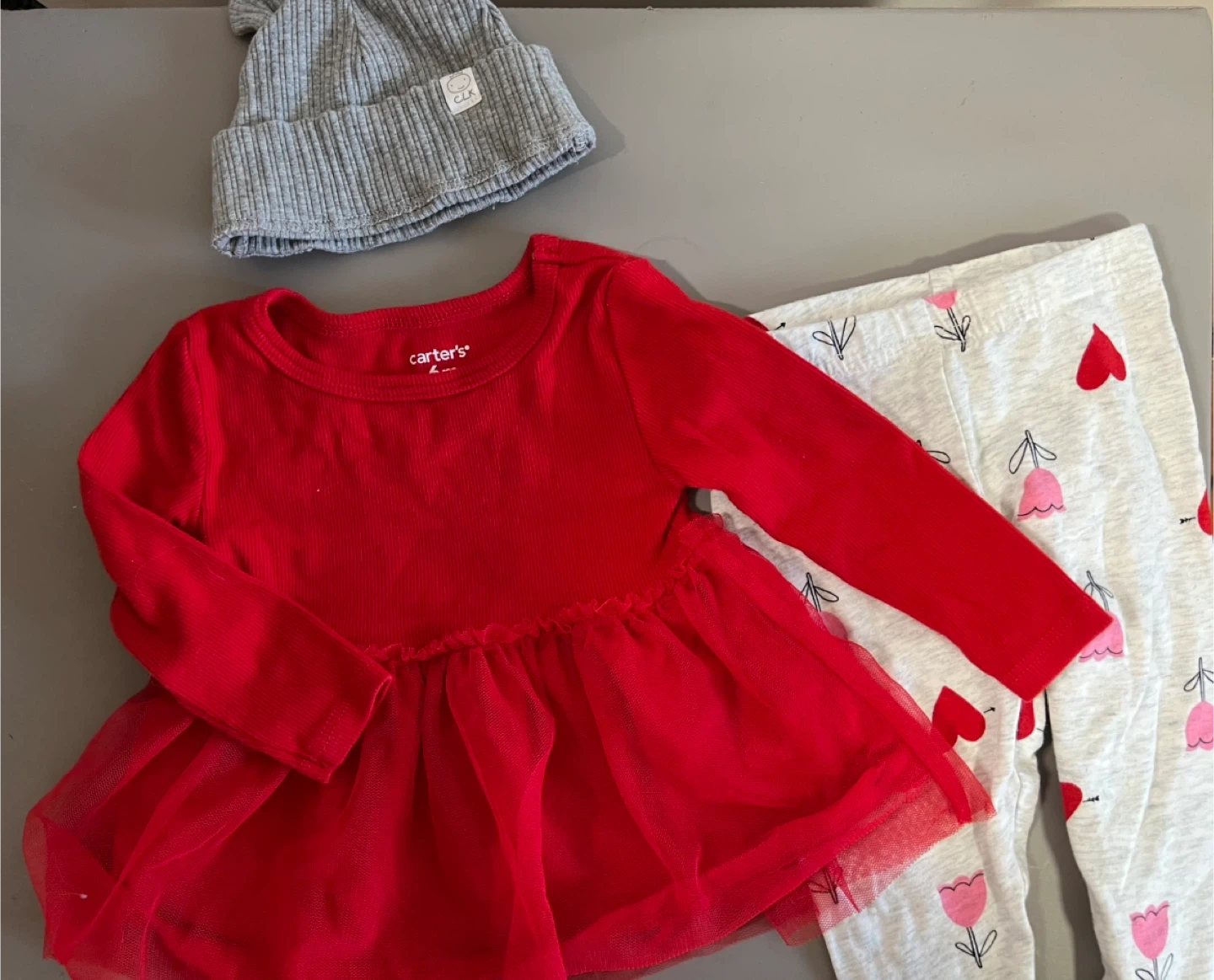 198Super cute Carter's baby outfit set! Includes a red dress with a tulle skirt, patterned pants, and a grey knit hat. Perfect for your little one!
