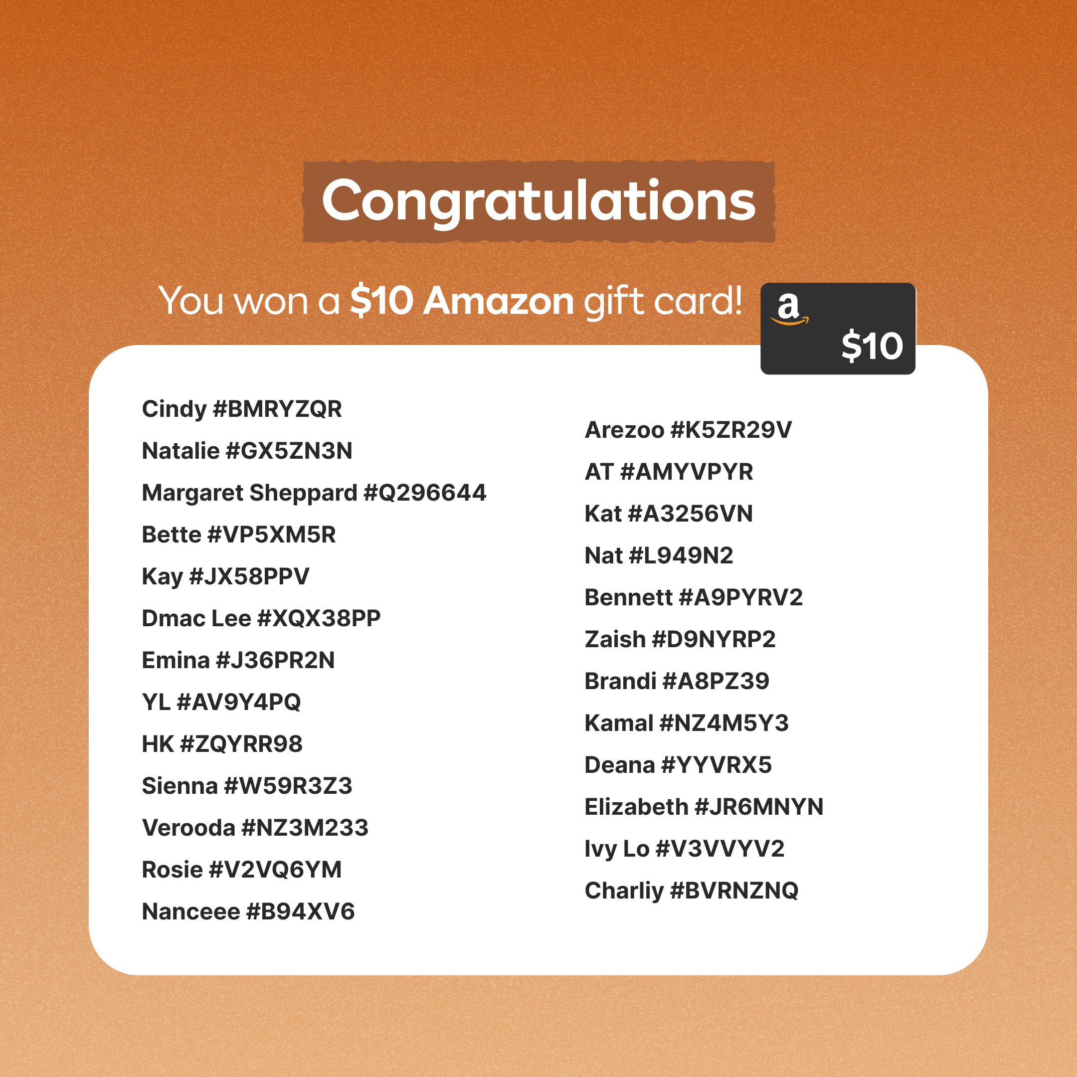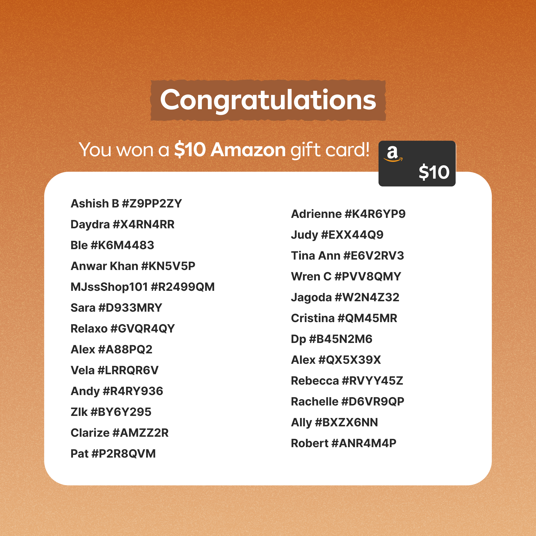 1000+Hey Karroters, Thanks for participating in our October Declutter event 🎉 We appreciate everyone who participated this time! Now, for the moment you’ve all been waiting for... the 100 winners + the 1 grand prize winner have been revealed 🥳 Please check the image above to see if you won! Winners 1. Amazon gift card winners - Please check your "My Rewards" section in the app. Gift cards have all been sent out! 2. Some users may share the same name so please check the unique user number. To view your user number go to My Karrot > View profile. 3. Share your excitement with the Karrot community in the comments down below! Don’t be discouraged if you didn't win this time, we run events at Karrot very often! Remember that these events are about more than just the rewards. You’re making someone’s day and helping us build a more community-based marketplace. Thanks for tuning in to this month's declutter challenge! 💗