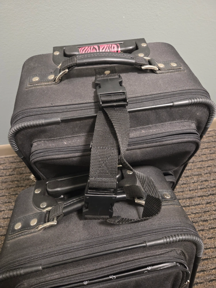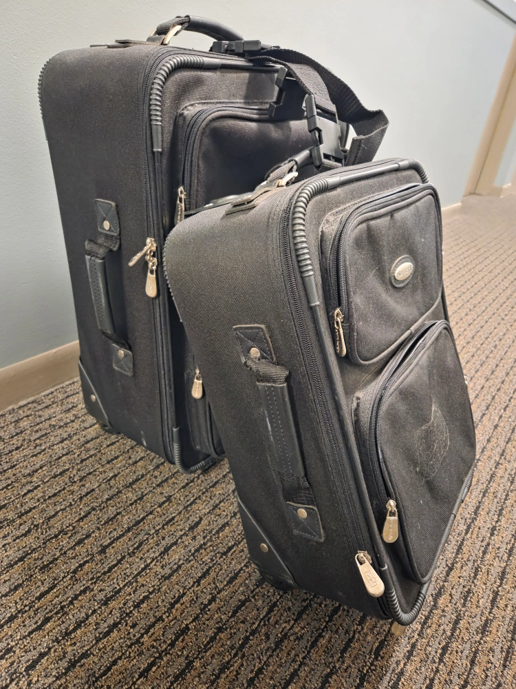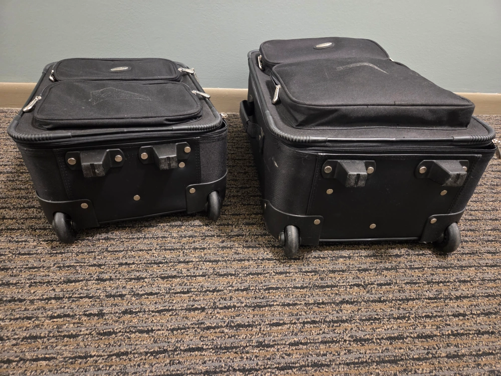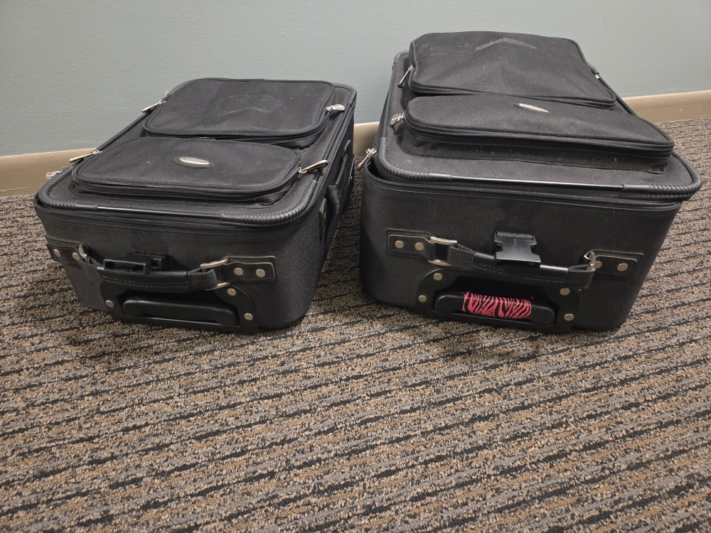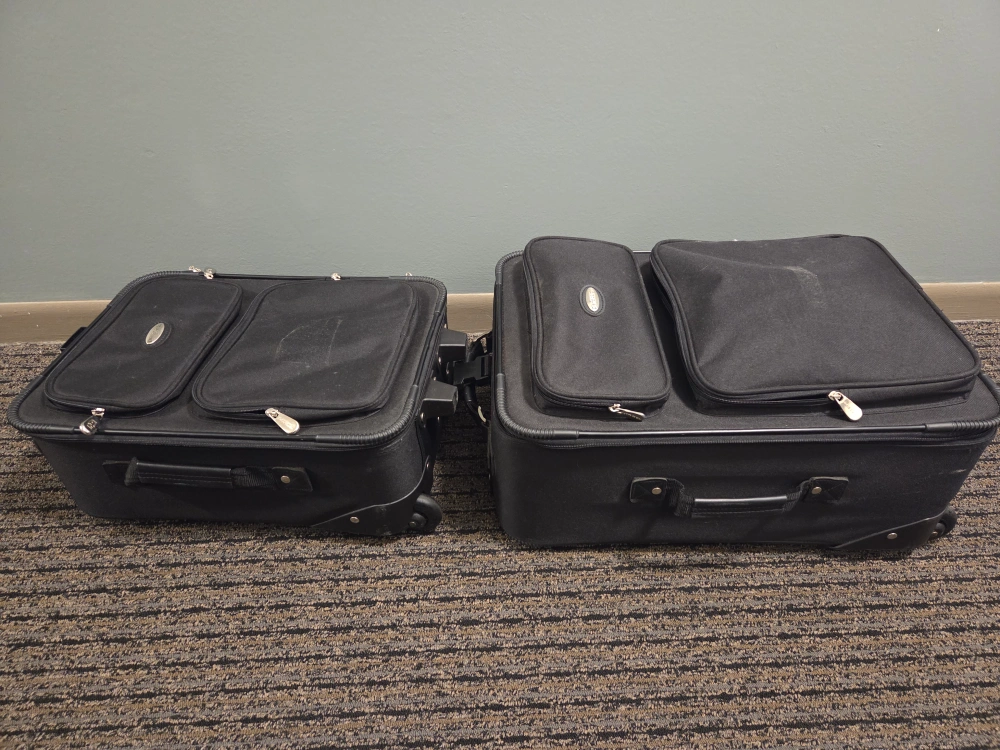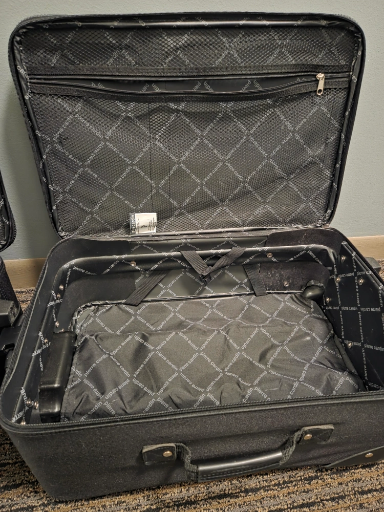 105Selling a set of two Pierre Cardin black luggage pieces. They're in used condition and ready for your next trip! The interior is lined with the Pierre Cardin logo.