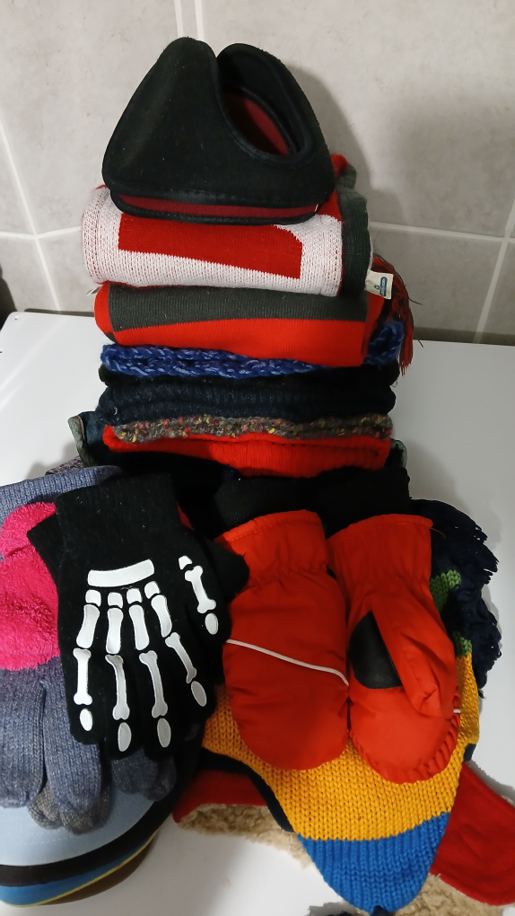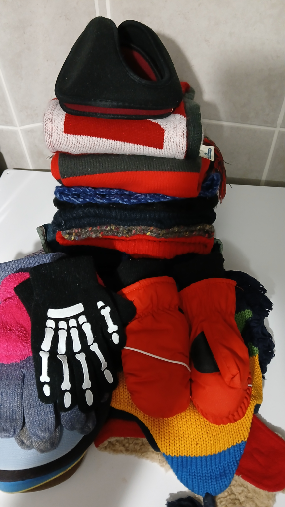 a collection of 33 kids hats, scarves, mitts and baseball caps. all for $10.00. porch pickup at Dufferin and Bloor st.