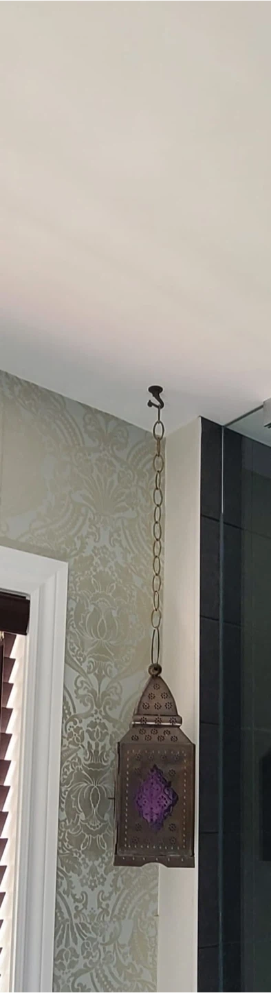 71Add a touch of global charm to your space with this hanging Moroccan-style lantern! It features a metal frame with intricate cutouts and a beautiful purple glass accent. Perfect for creating a cozy and inviting atmosphere in any room