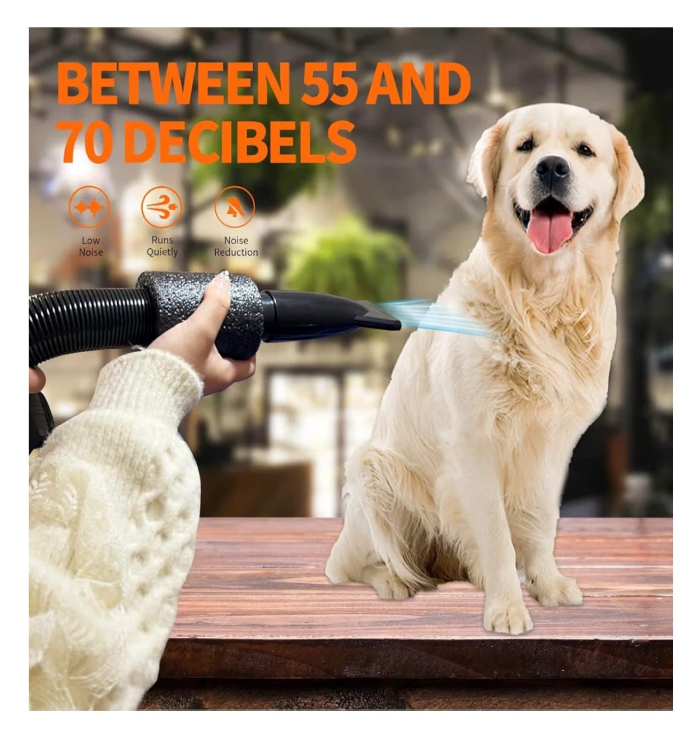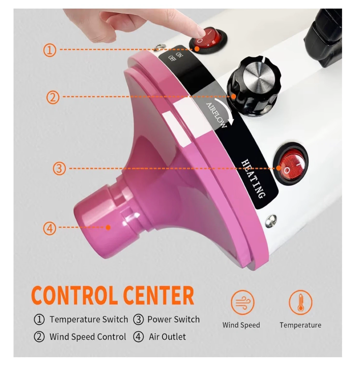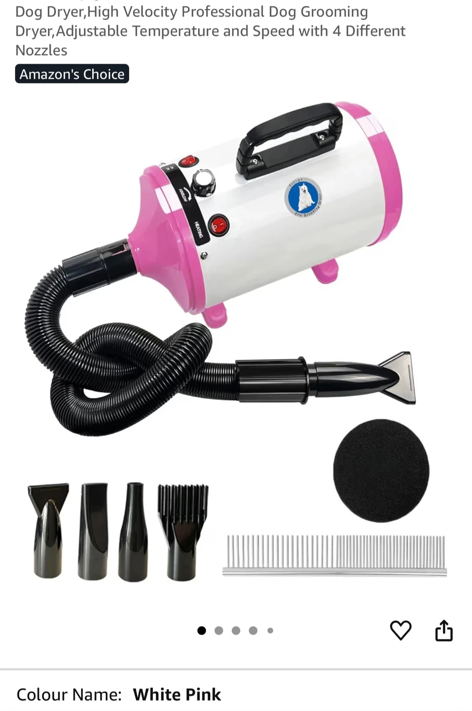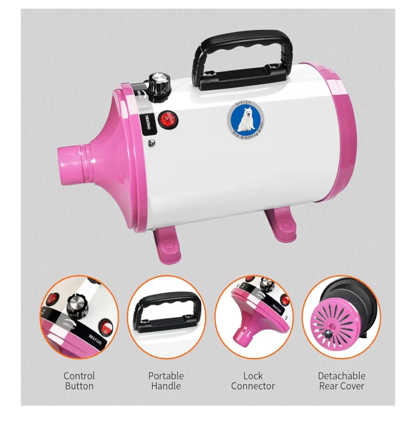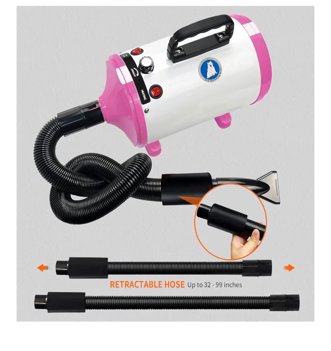 63This is a high velocity professional dog grooming dryer. It has adjustable temperature and speed with 4 different nozzles. The hose is retractable up to 32-99 inches. It features high airflow, a control center, a portable handle, a lock connector, and a detachable rear cover