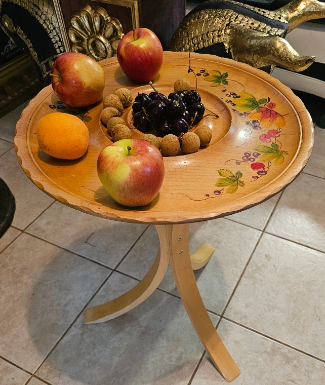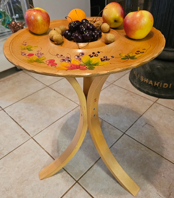 This is a charming hand-painted wooden side table. It features a unique design with floral patterns around the edge of the tabletop. The table has a light wood finish and a sturdy, curved leg base. It's perfect for adding a touch of whimsy to any room!