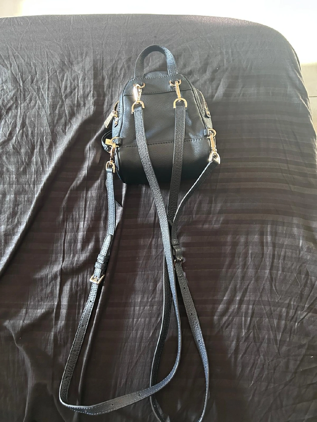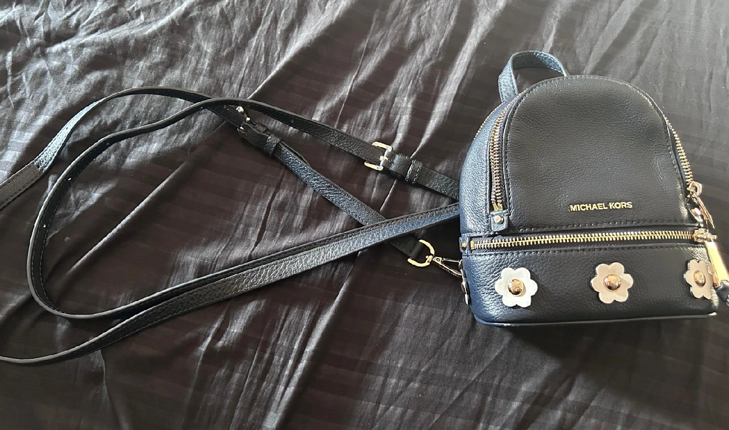 Cute Navy Blue Michael Kors mini backpack in great condition! Features flower details and gold zippers, perfect for adding a stylish touch to any outfit. Can be used as crossbody or backpack.