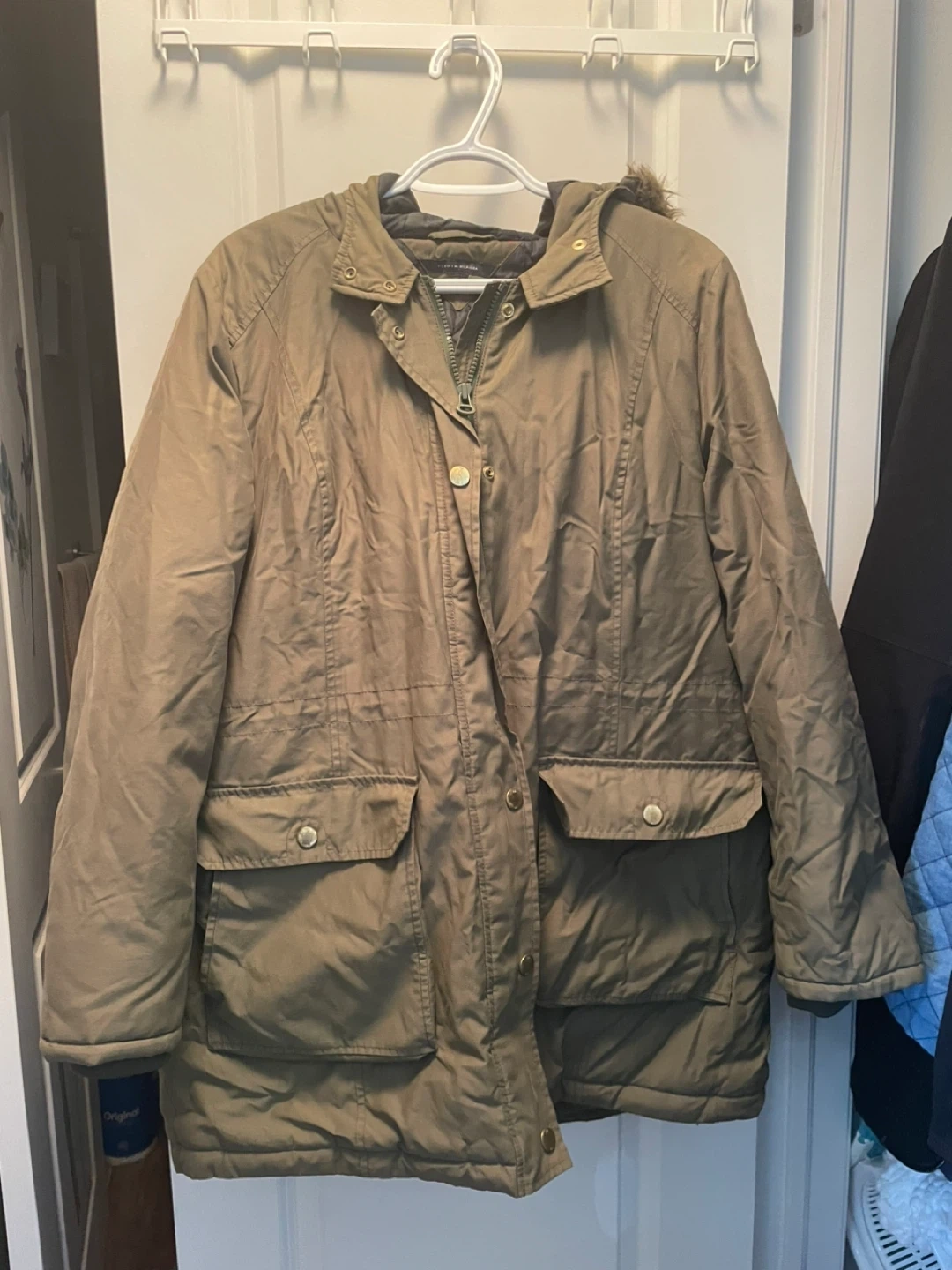 124Tommy Hilfiger olive green winter coat with a hood. It's in excellent condition and ready to keep you warm this winter! Excellent warm winter coat. Excellent condition. Lined winter coat. Pick up is Jane and Lawrence in North York. Cash only.