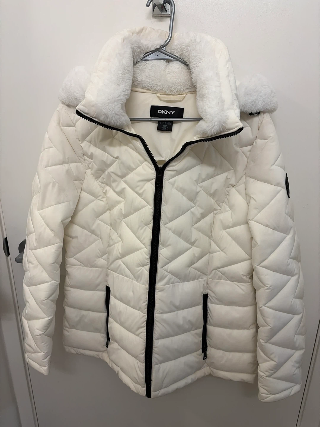 171Selling a Machine washable DKNY puffer jacket. It's a size L and features a cozy faux fur trim on the hood and collar. Perfect for staying warm and stylish during the colder months!