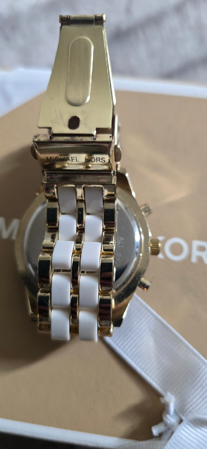 Selling a beautiful Michael Kors watch, model MK-6038! It features a gold-tone finish with white accents on the band. A stylish accessory to elevate any outfit! Still has the plastic protector on the watch face.