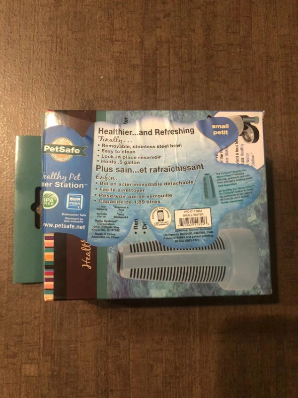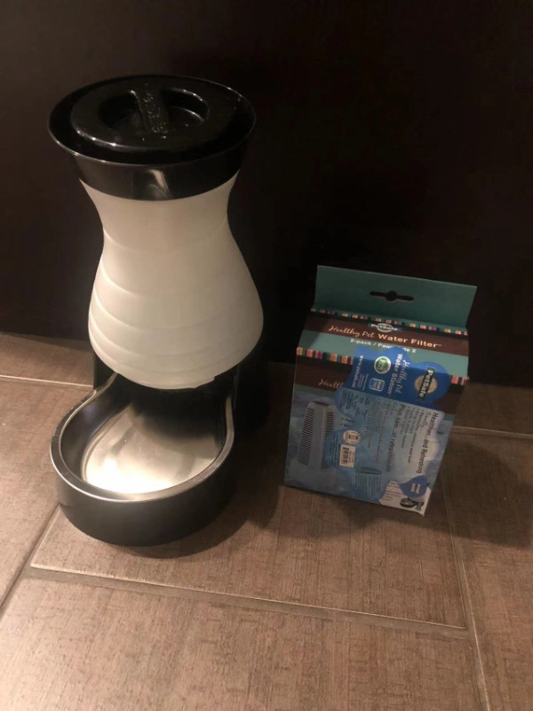 91In Great Condition. A new filter is included. Pick up only. This gravity water feeder allows you to keep your pet hydrated at all times of the day or night; the reservoir holds up to 320 oz. of water. The reservoir is made of durable BPA-free plastic and locks are in place to help prevent knocks over and spills. The bowl is stainless steel and more hygienic for your pet. Disassembles for easy cleaning; stainless steel bowl is dishwasher safe.