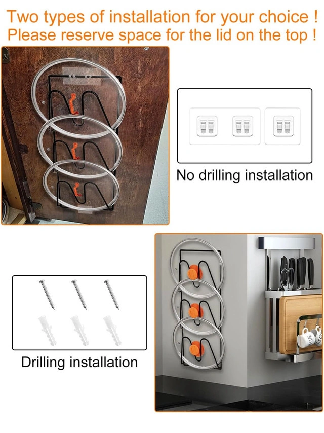 Keep your kitchen tidy with this new pot lid organizer rack, perfect for mounting on the wall or inside a cabinet. This brand new space-saving solution is designed to hold multiple lids securely, making it an essential addition to any organized kitchen. The metal frame is also stretchable. Installation hardware is included, offering both no-drilling and drilling installation options. Specifications: * Material: Metal * Installation: Wall-mounted/Cabinet * Capacity: Holds multiple lids * Dimensions: 13.4 inches (height) x 6.3 inches (width) x 2 inches (depth) if you see this ad, it's still up for grabs!