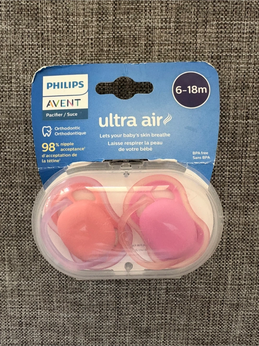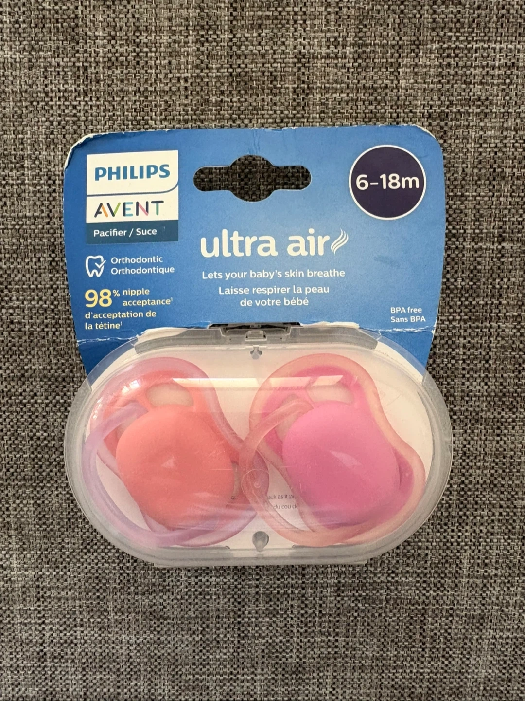 68Selling a Philips Avent Ultra Air pacifier suitable for babies aged 6-18 months. It comes with two orthodontic pacifiers and a sterilizing/carrying case. These pacifiers have 4 extra-large air holes for maximum airflow, helping your baby's skin breathe! They are BPA free Nepean