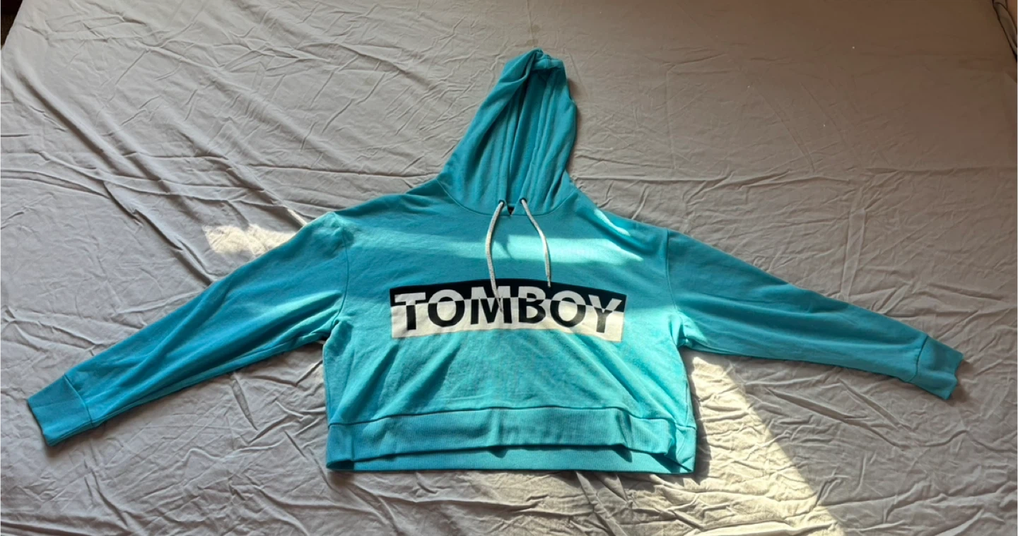 Selling a Love & Legend TOMBOY hoodie in size 1X. The hoodie is a vibrant turquoise colour and features a drawstring hood. It's in great condition and ready for a new home!