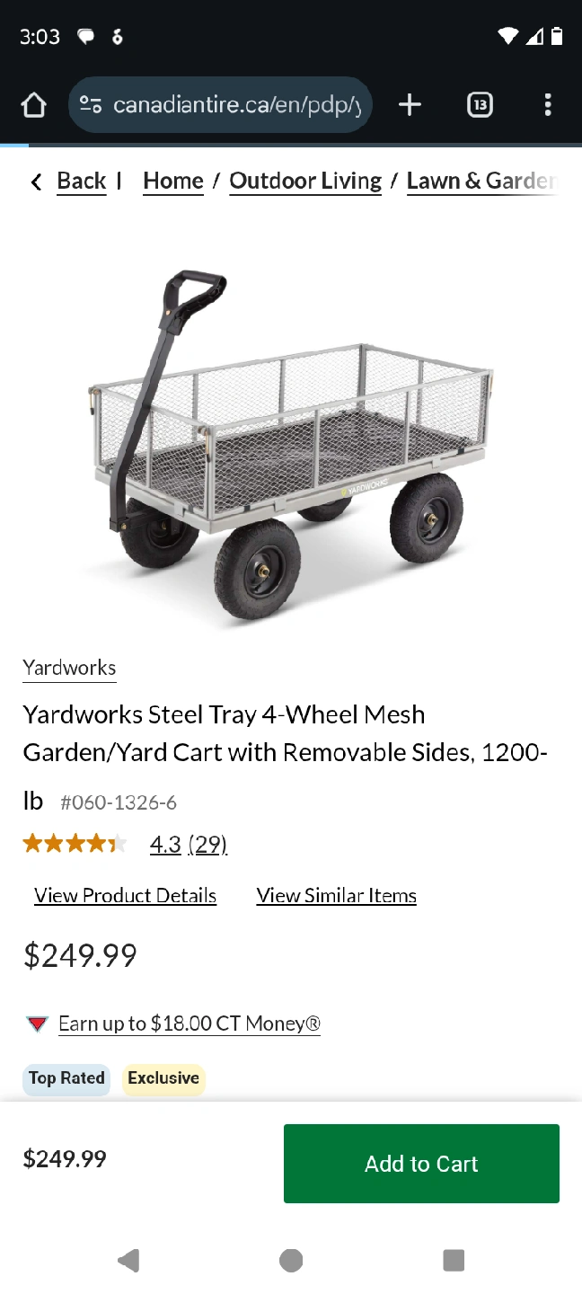 Buy & SellYardworks Steel Tray Garden/Yard CartYardworks Steel Tray Garden/Yard Cart$56Selling a Yardworks steel tray 4-wheel mesh garden/yard cart. It has removable sides and can hold up to 1200 lbs. Originally bought for $249.99EstadoLike newWHERE TO MEETsouth kingswayView MapSELLERverifiedNoahHigh Park Swansea791 review1 chats·1 favorites·18 viewsSEND CHAT TO SELLERHi Noah! I’m interested in your listing.Hi Noah! I’m interested in your listing.Get the Karrot app to chatSign In to chat