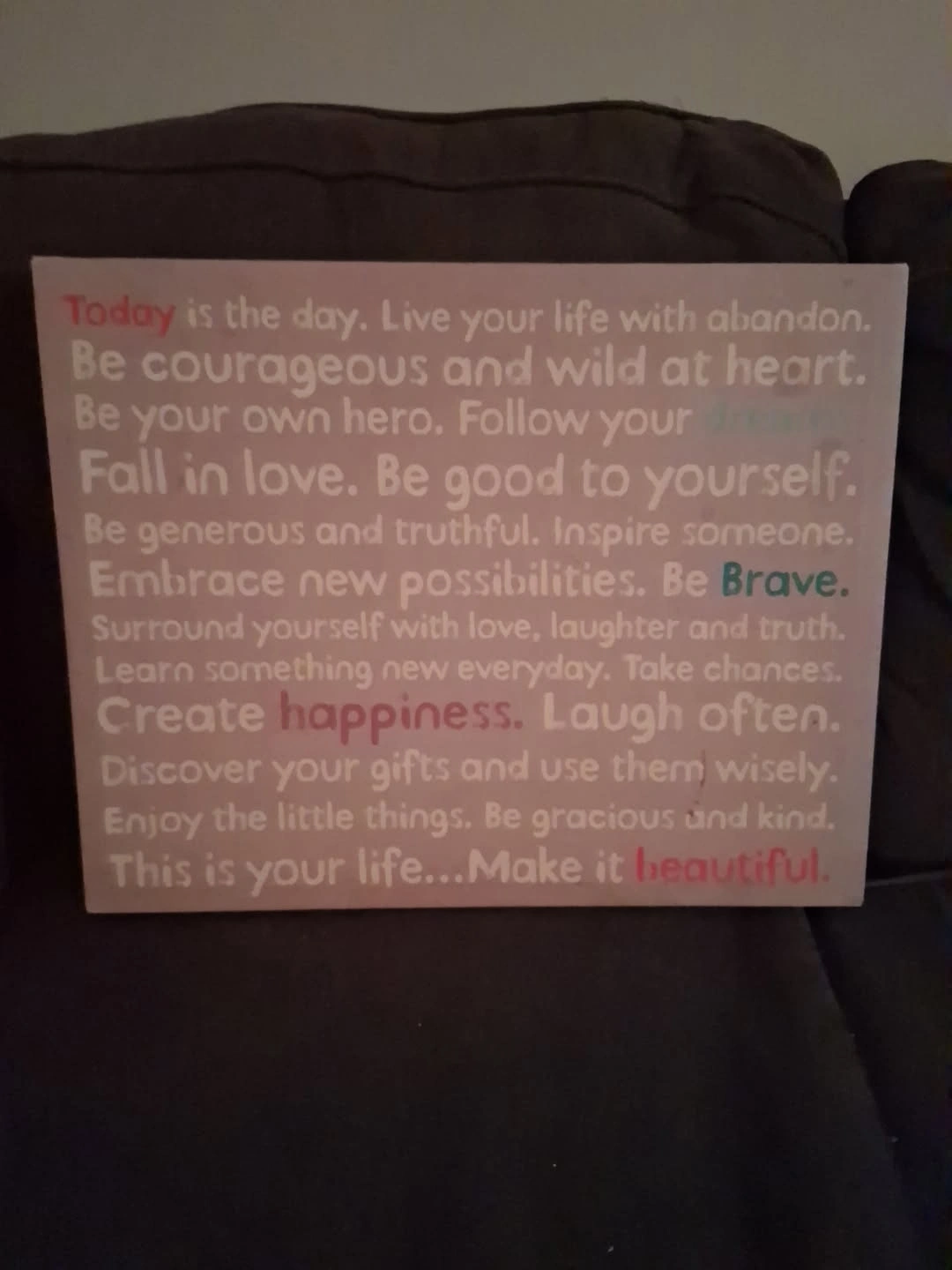 65This is a piece of wall decor with an inspirational quote. The quote includes phrases like 'Live your life with abandon' and 'Create happiness'. It's a nice reminder to make the most of each day
