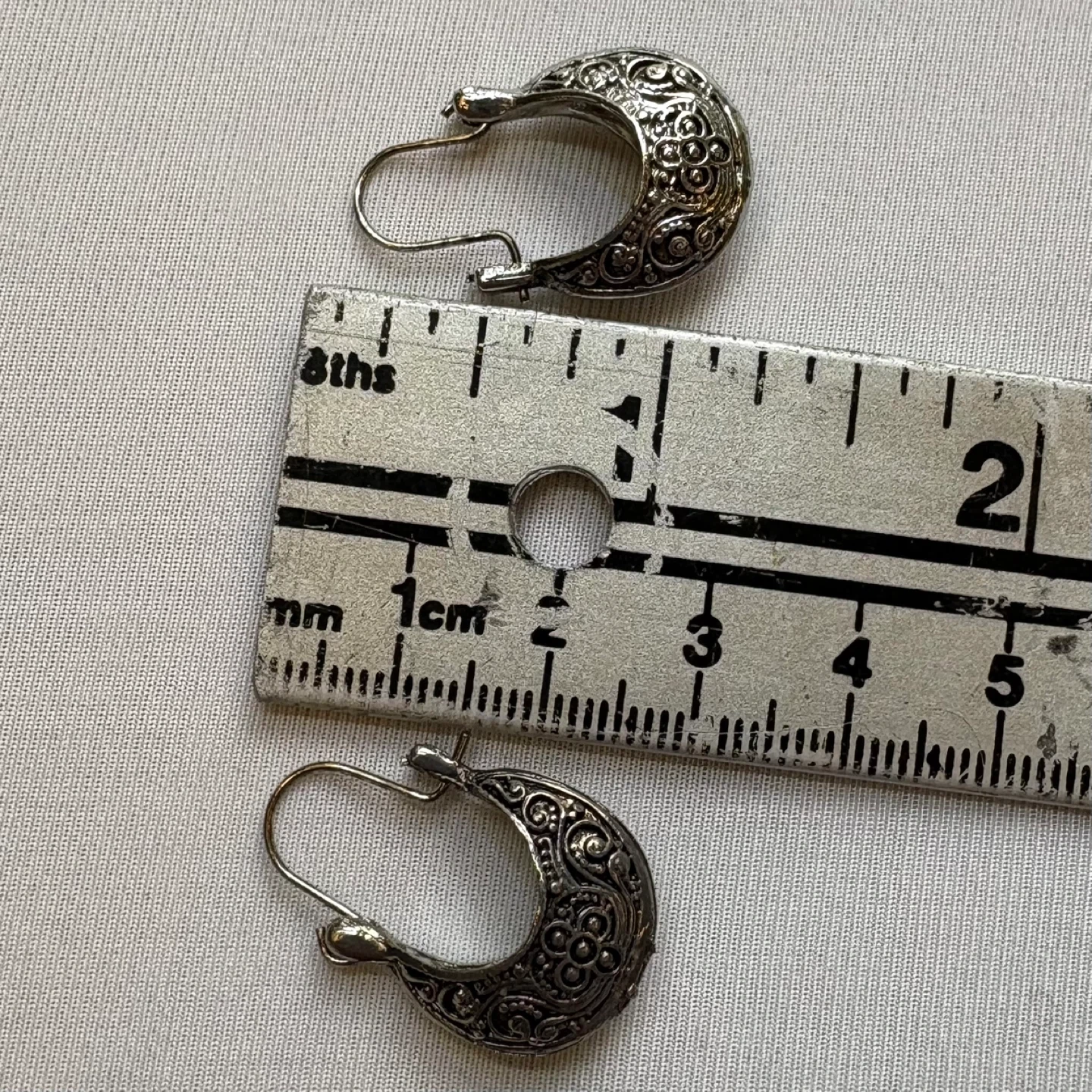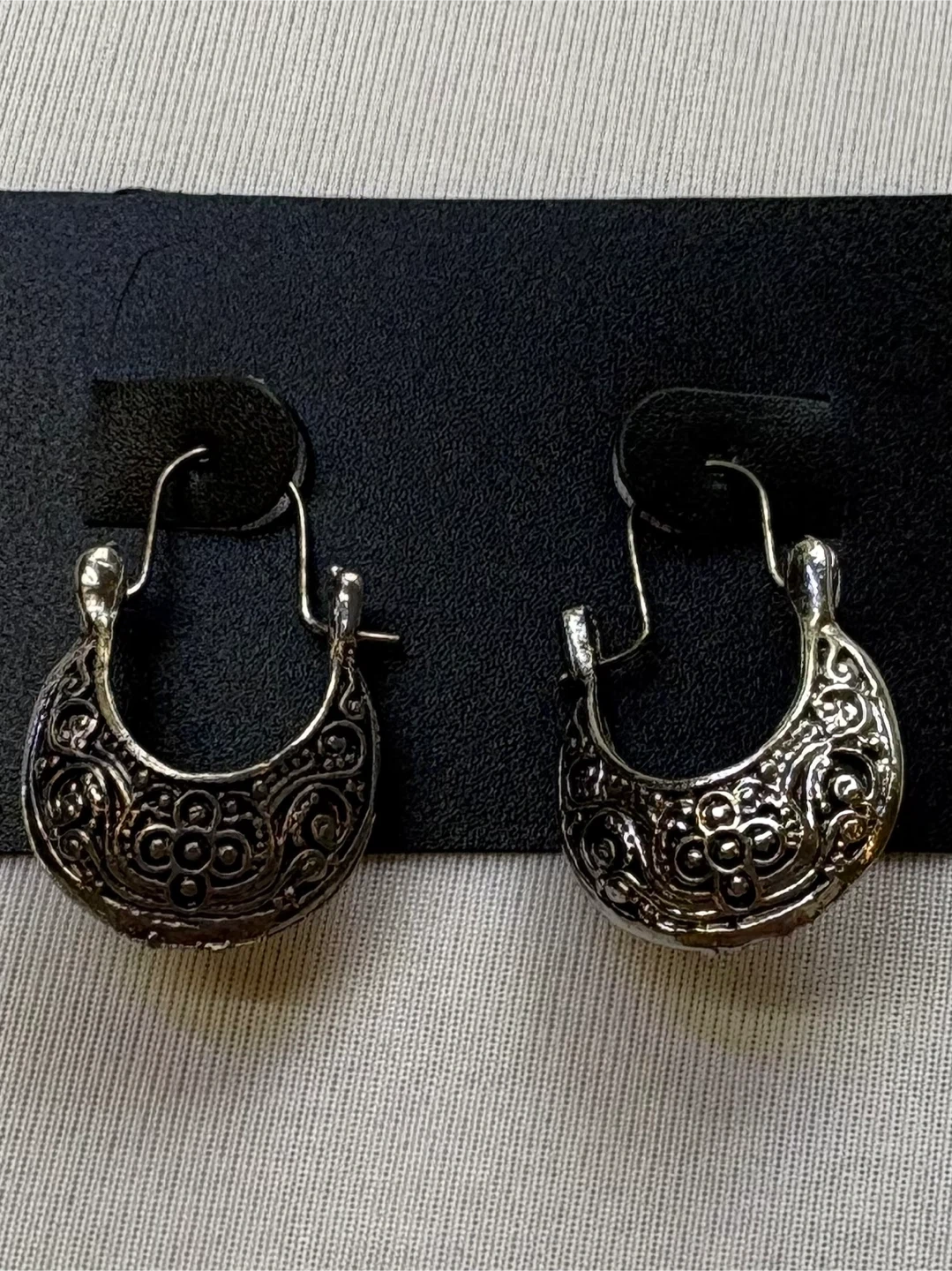 These elegant silver-tone basket hoop earrings feature intricate floral and scroll engravings reminiscent of antique jewelry craftsmanship. Their medium-sized crescent shape and design make them comfortable for all-day wear. Perfect for adding a vintage-inspired touch to any outfit.