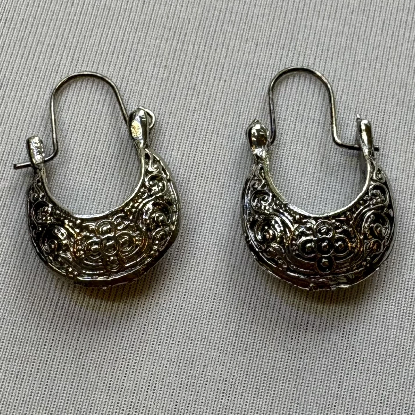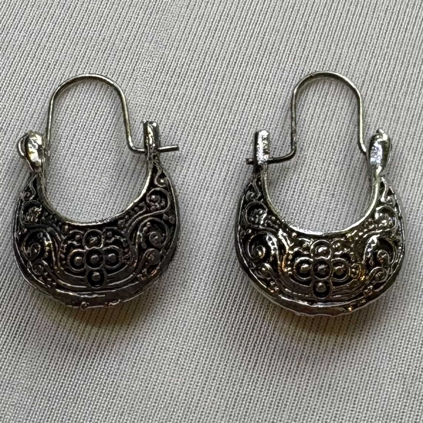 silver earrings, antique style earrings, vintage basket hoop earrings, floral engraved jewelry, boho earrings, silver tone hoops, classic earrings, ornate jewelry, women’s accessories, statement earrings