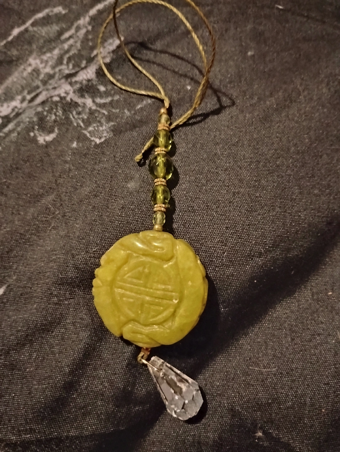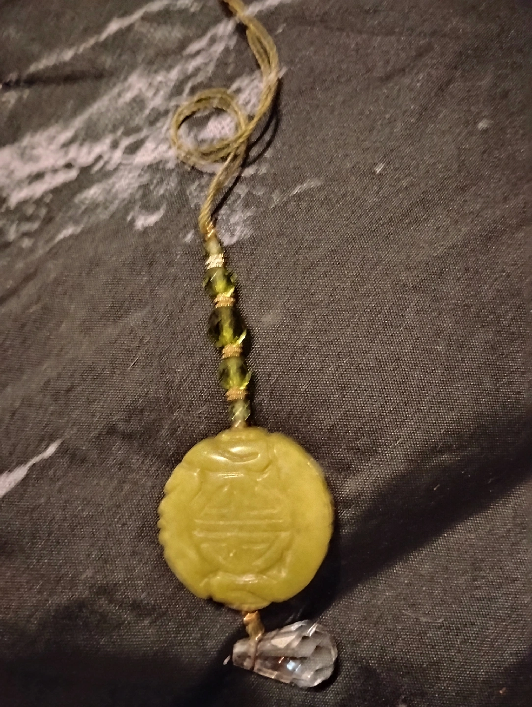 65Selling a lovely jade pendant featuring a unique design and a crystal drop. It's in great condition and would make a beautiful addition to any collection!