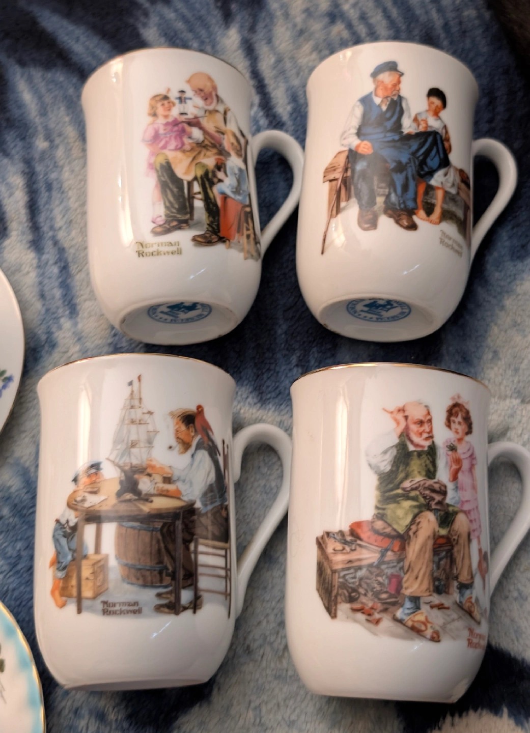 Selling a set of Norman Rockwell collectible mugs! They feature different iconic scenes. Perfect for collectors or anyone who appreciates classic art