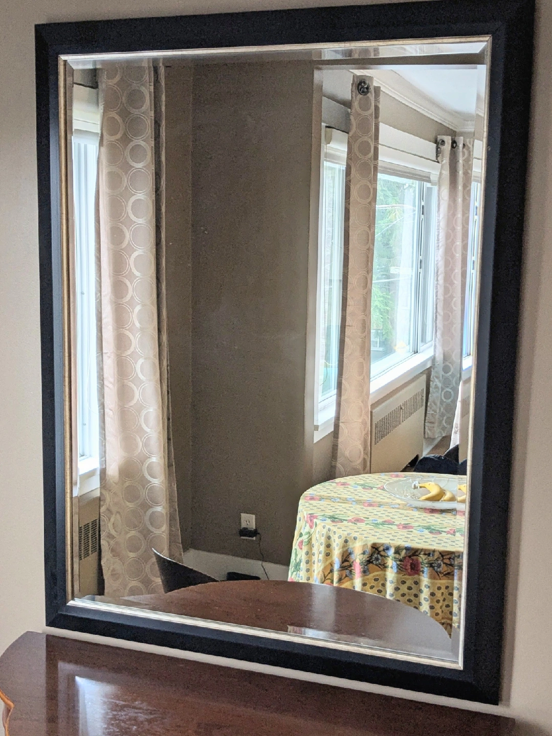 132Selling a framed mirror in great condition! It has a simple, elegant brown frame that would look great in any room. Measures 35"W x 45"L.