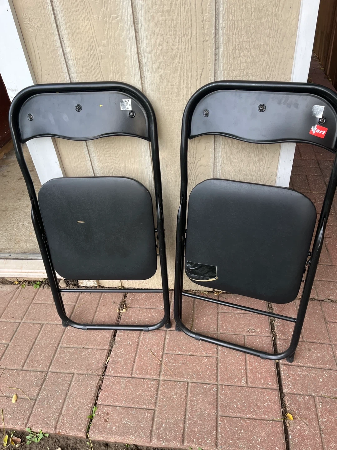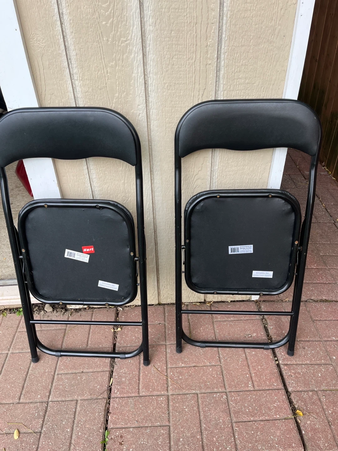 Selling a set of two black folding chairs from Hart. They're in used condition, with some wear and tear on the seats. Perfect for extra seating when you have guests over!