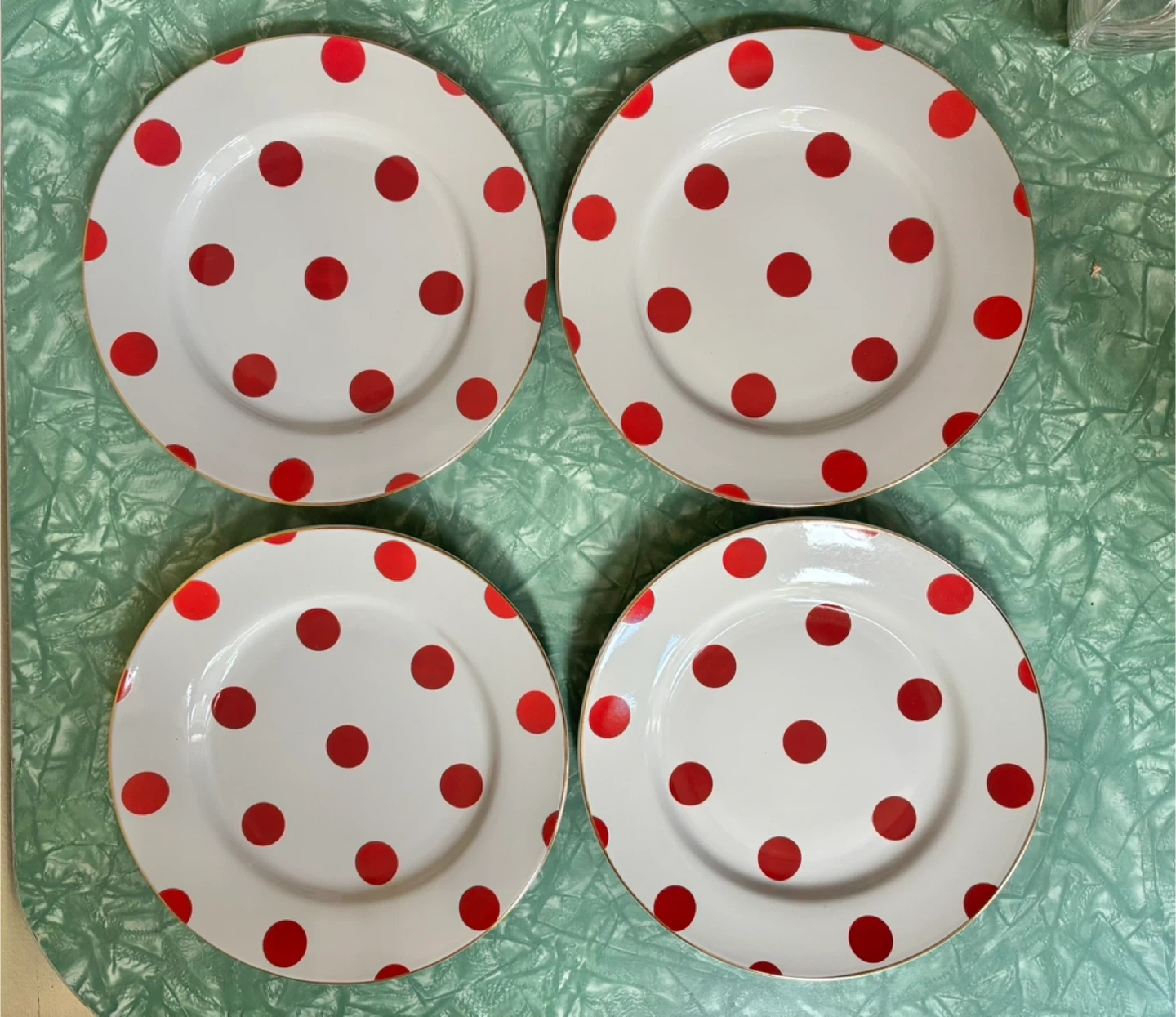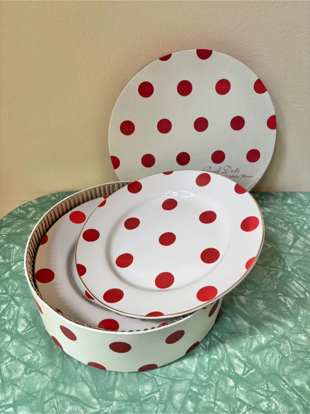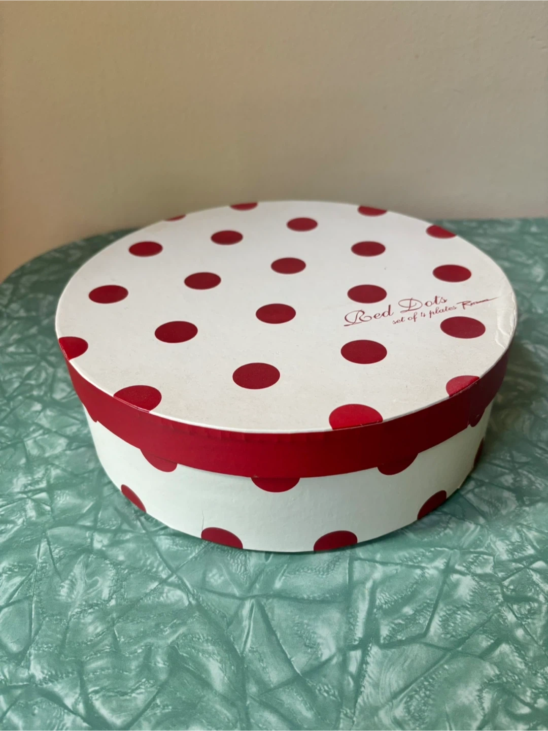 Selling a set of four Rosanna Red Dots plates! They are in great condition and come in their original box. Each plate is about 9 inches in diameter. These are perfect for adding a pop of colour to your table setting. Box shows minor wear. Dishes hardly used!