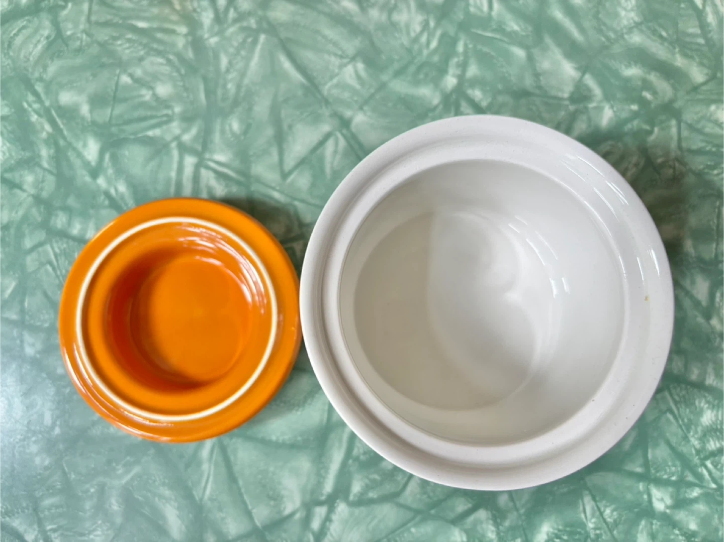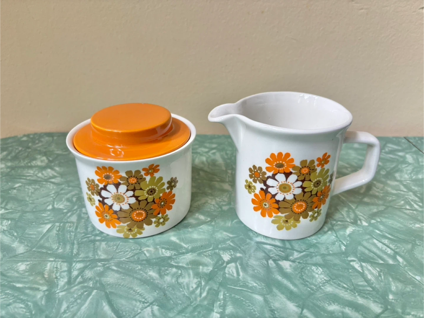 Cute vintage creamer and sugar bowl set with a groovy floral design! The creamer stands about 4 inches tall, and the sugar bowl is around 3 inches. Perfect for adding a touch of retro charm to your kitchen or tea set