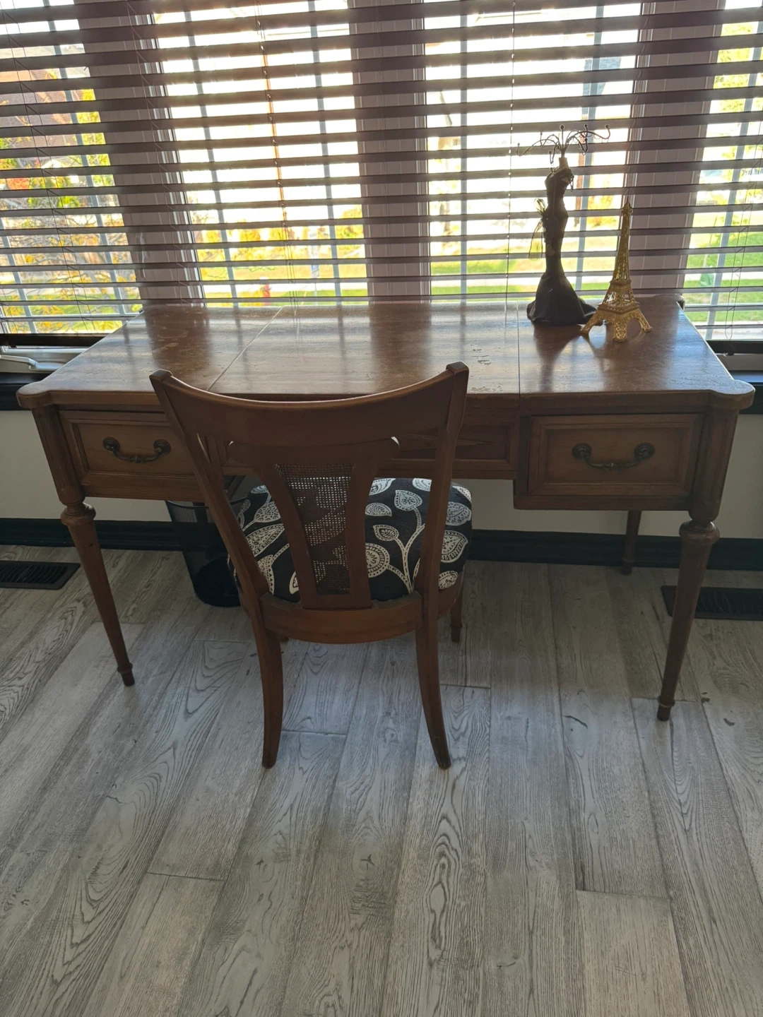 Elegant vintage solid wood vanity desk with built-in mirror and original brass hardware.