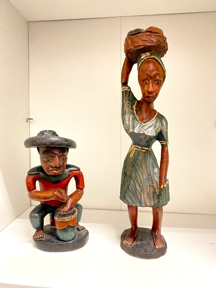106Selling a pair of hand-carved wooden figurines. One is a woman carrying a basket on her head and the other is a man playing a drum. They would make a great addition to any collection!