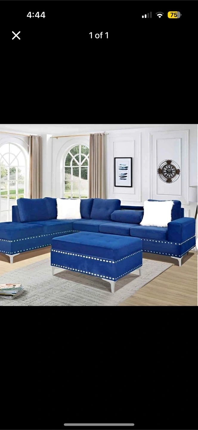 Selling a beautiful blue sectional sofa that includes an ottoman. It's a great addition to any living room and provides plenty of seating and comfort. The ottoman is perfect for kicking your feet up after a long day! It also has a coffee/drinks holder and over kept cleaned I get it professionally deep clean every 6 months which will show on the slides.