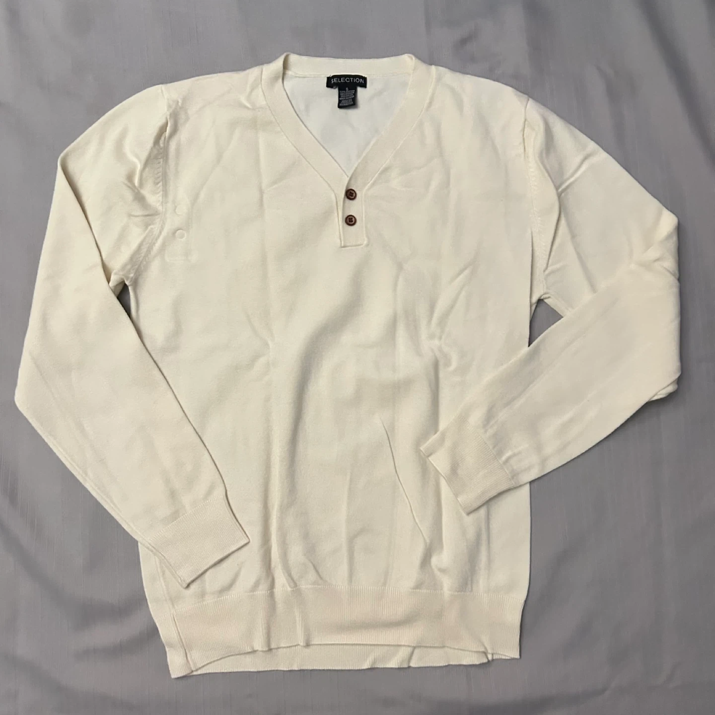 Selling a cream-coloured V-neck sweater. It's in great condition and ready for a new home!