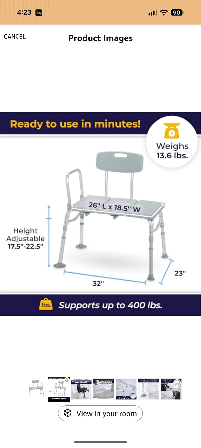 Selling a brand new Drive Transfer Tub Tub Bench in its original box! It's a knock-down model, making it easy to assemble without tools. The bench provides a safe and comfortable bathing experience. It weighs 13.6 lbs and supports up to 400 lbs. Dimensions are 26" L x 18.5" W, and the height is adjustable from 17.5" to 22.5"
