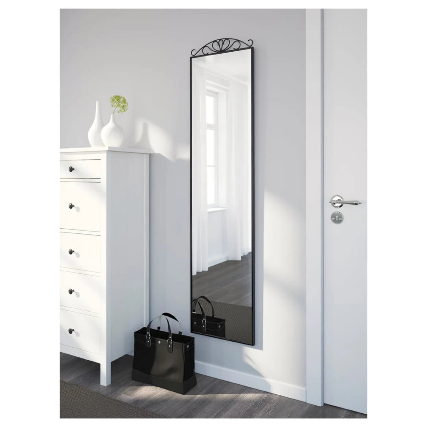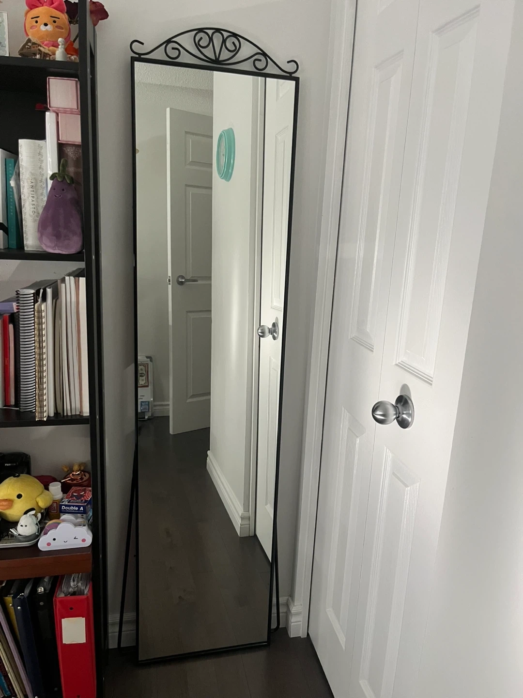 Selling a gently used IKEA mirror in black. This is a full-length mirror that can either be hung on the wall or used as a standing mirror. It's perfect for bedrooms, walk-in closets, or entryways. It's in great condition and ready for a new home!