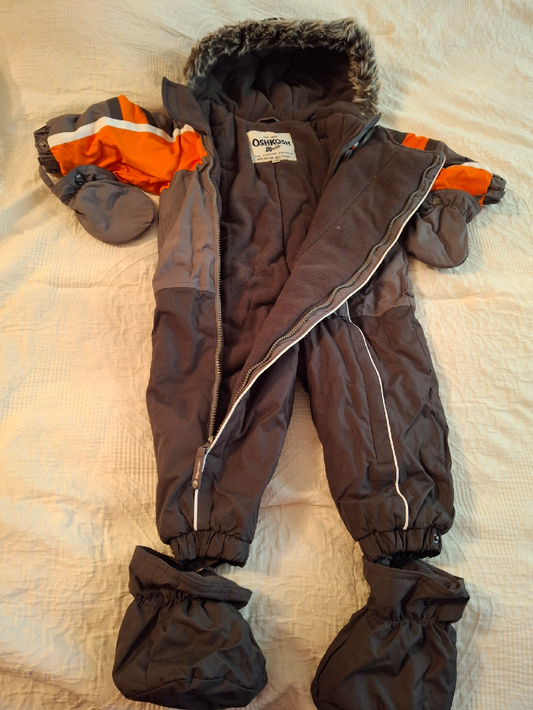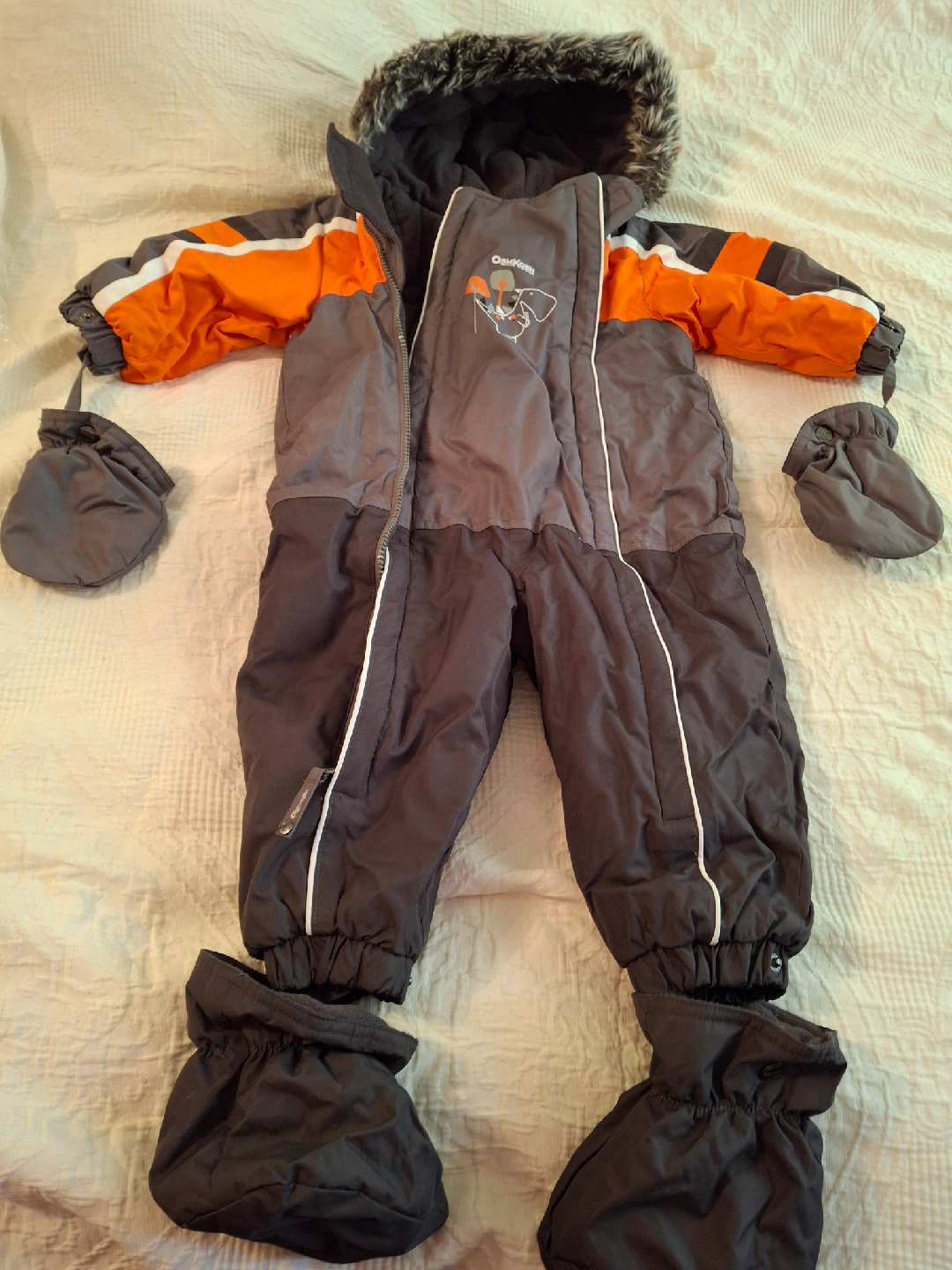 Selling an OshKosh B'gosh snowsuit, perfect for keeping your little one warm this winter! It's size 24M and features a cozy hood with faux fur trim, attached mittens, and booties to keep tiny hands and feet snug. The snowsuit is in great condition and ready for snowy adventures!
