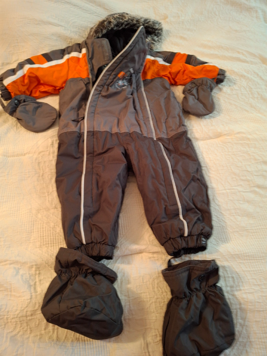 Selling an OshKosh B'gosh snowsuit, perfect for keeping your little one warm this winter! It's size 24M and features a cozy hood with faux fur trim, attached mittens, and booties to keep tiny hands and feet snug. The snowsuit is in great condition and ready for snowy adventures!