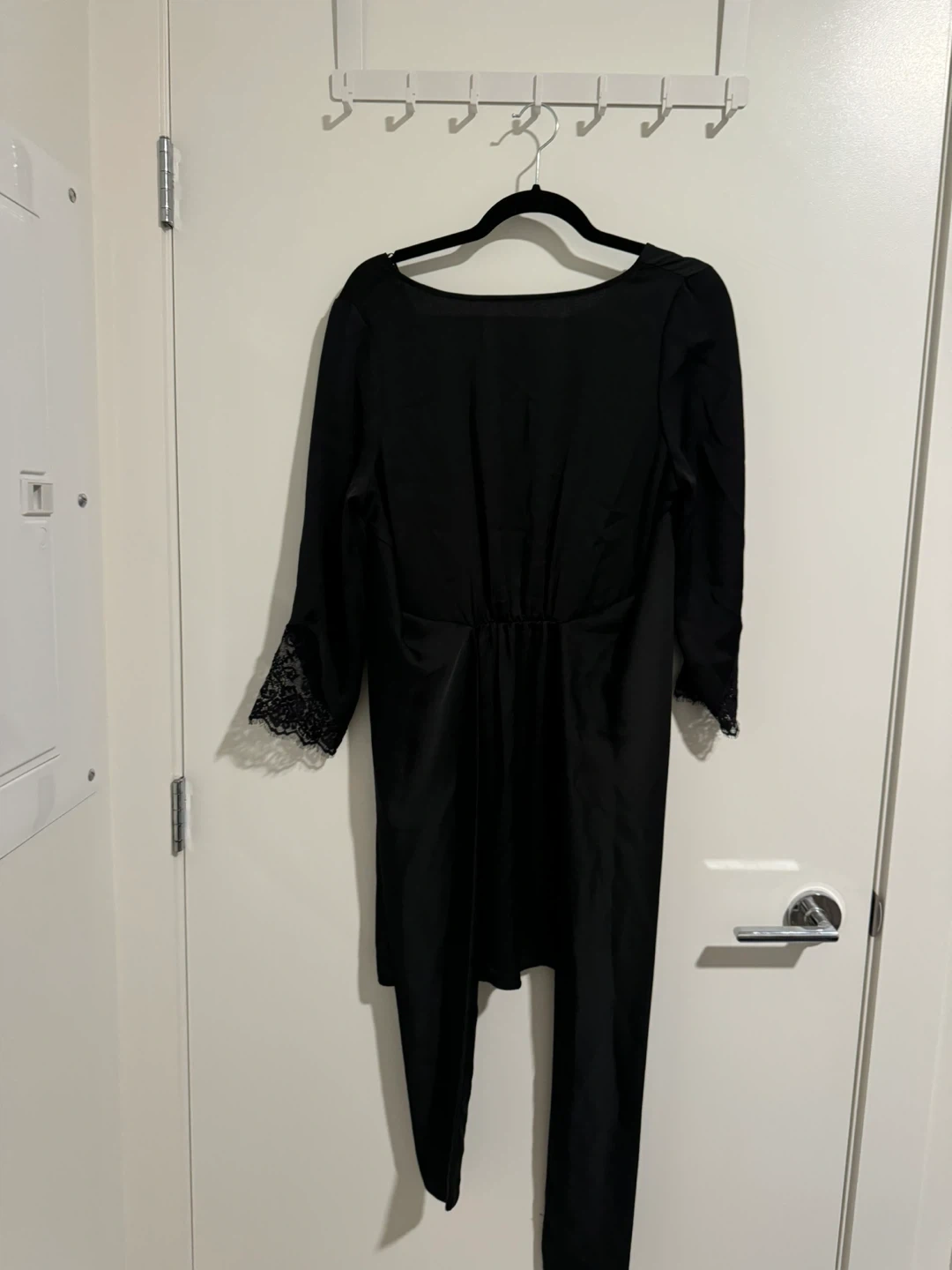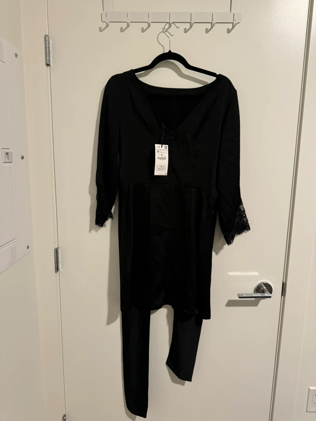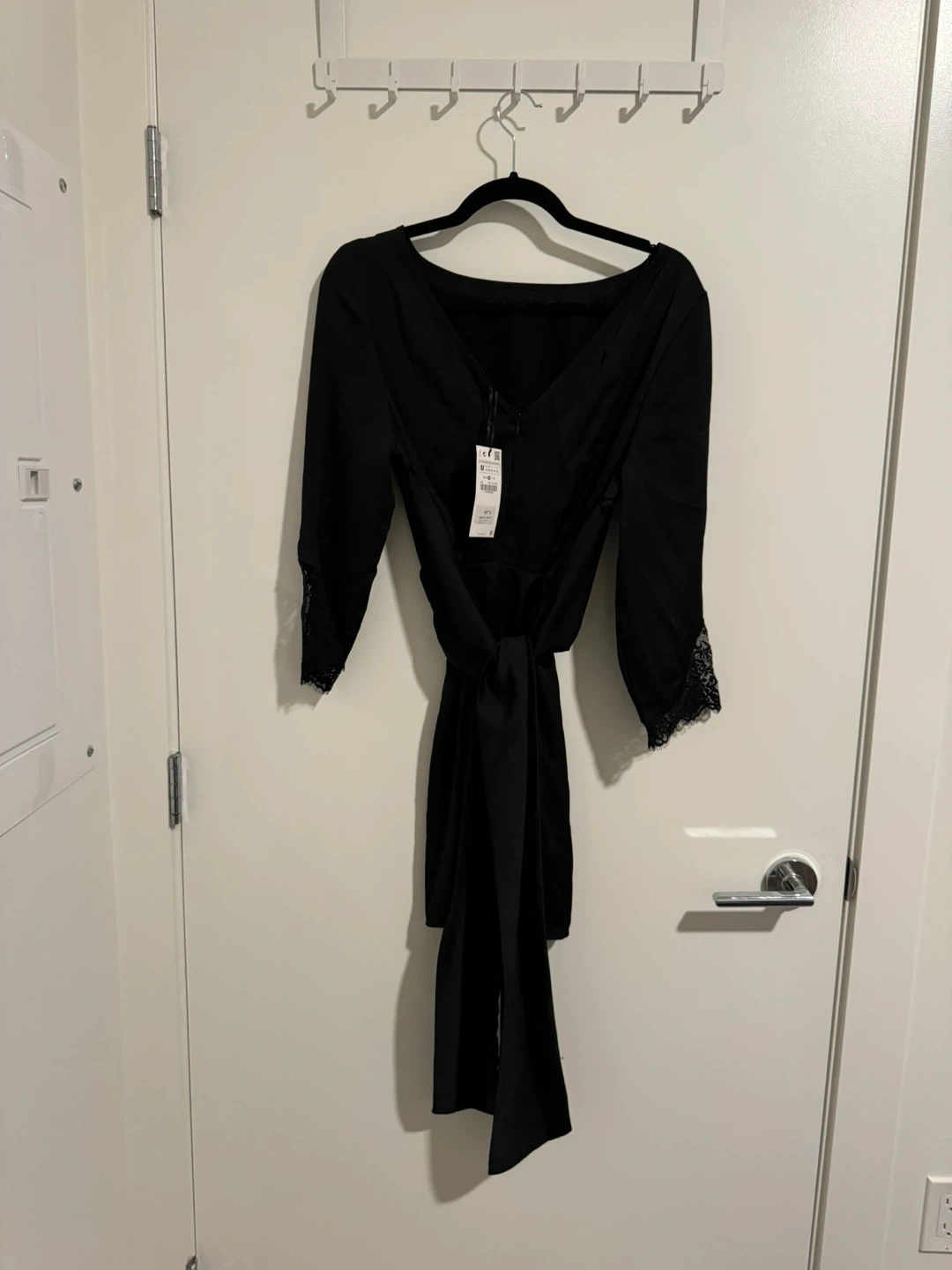 Selling a Zara black dress. It features long sleeves with lace detailing at the cuffs. The dress ties at the waist. Perfect for a night out!