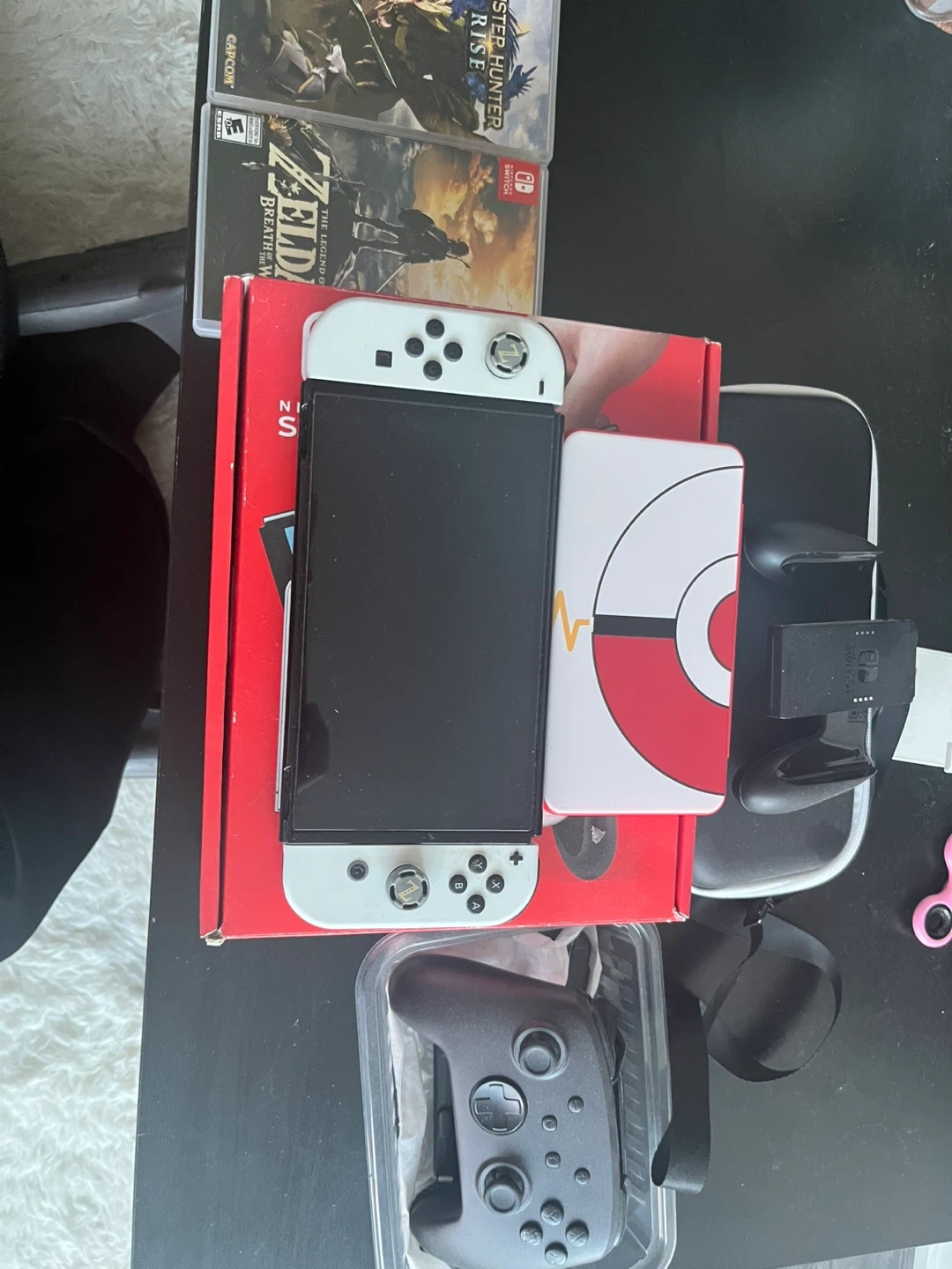 Selling a Nintendo Switch OLED model in white! Comes with the original box and accessories. Also included is a carrying case and a pro controller! With two game cards and some games purchased OL.