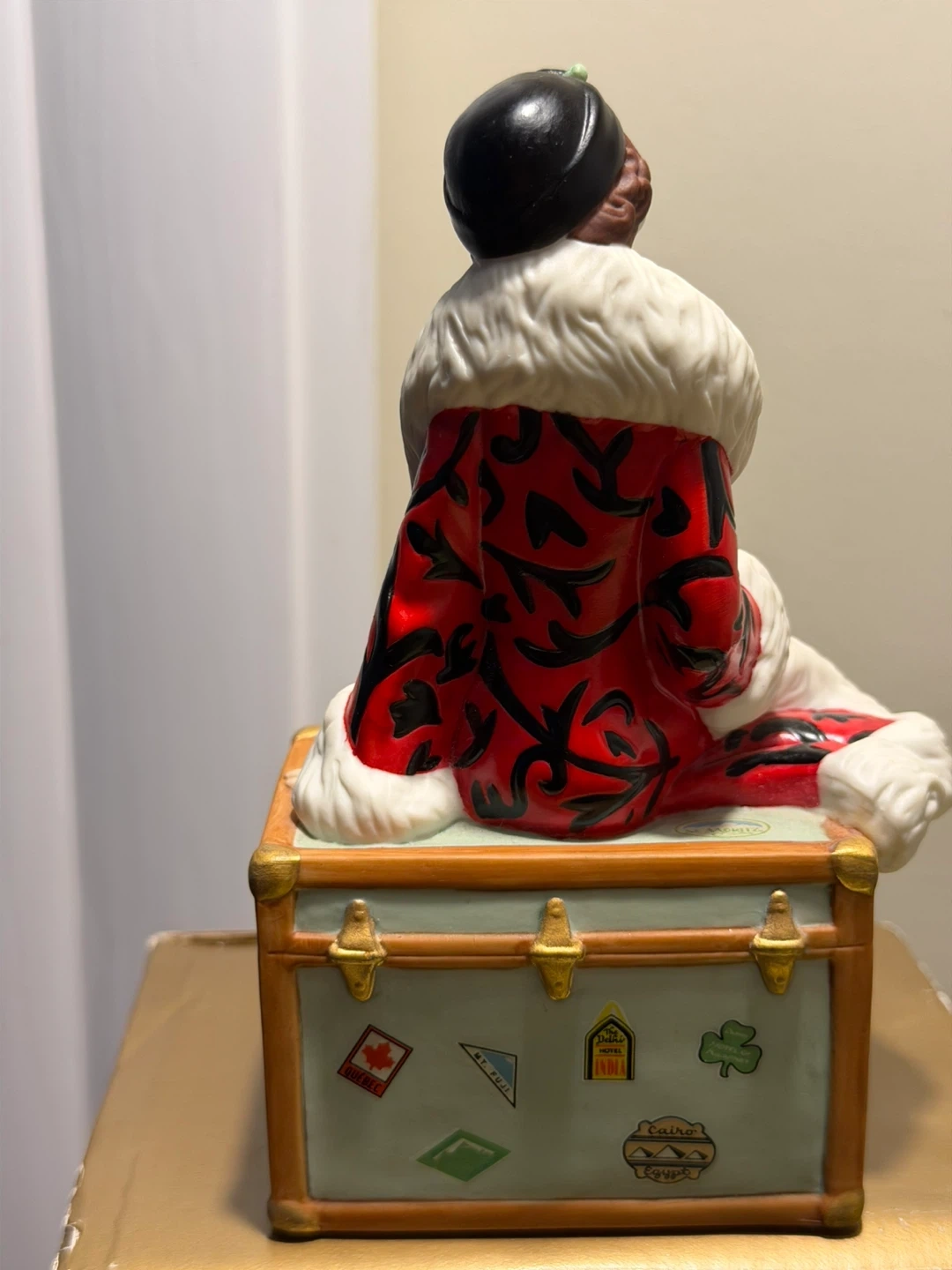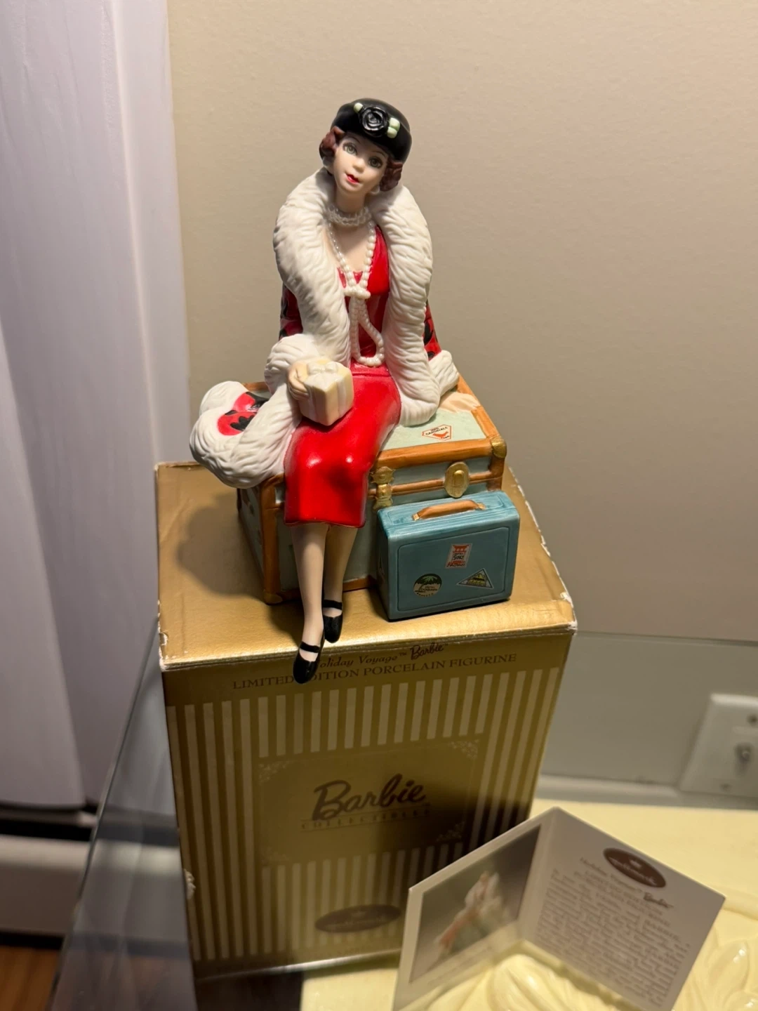Add a touch of vintage glamour to your collection with this exquisite Holiday Voyage Barbie Limited Edition Porcelain Figurine. This used figurine, inspired by the 1998 Hallmark exclusive Barbie doll, features Barbie in a stylish red dress and faux fur stole, seated atop vintage luggage. A must-have for any Barbie enthusiast or collector of fine porcelain figurines. This item is edition number 99 of 24,500. This item is in good condition but the box shows some wear. It comes with the original box and paperwork. If you're reading this, the figurine is still available, so don't miss out!