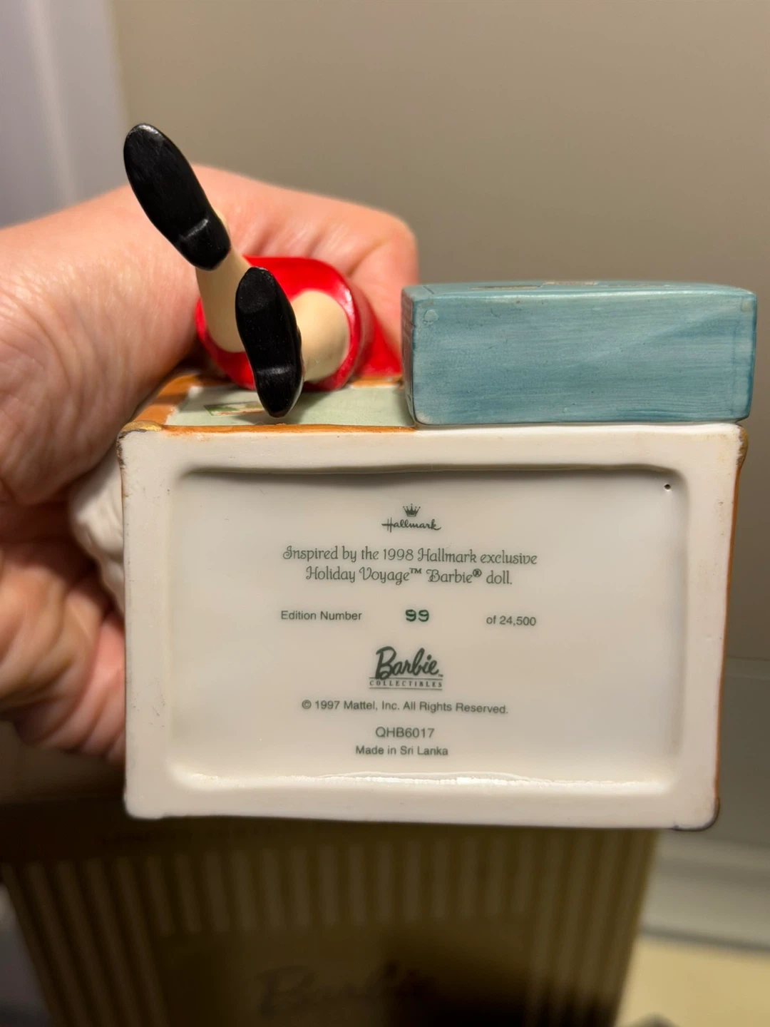 Selling a Hallmark exclusive Holiday Voyage Barbie doll figurine. This is edition number 99 of 24,500. Made in Sri Lanka. Would make a great addition to any collection!