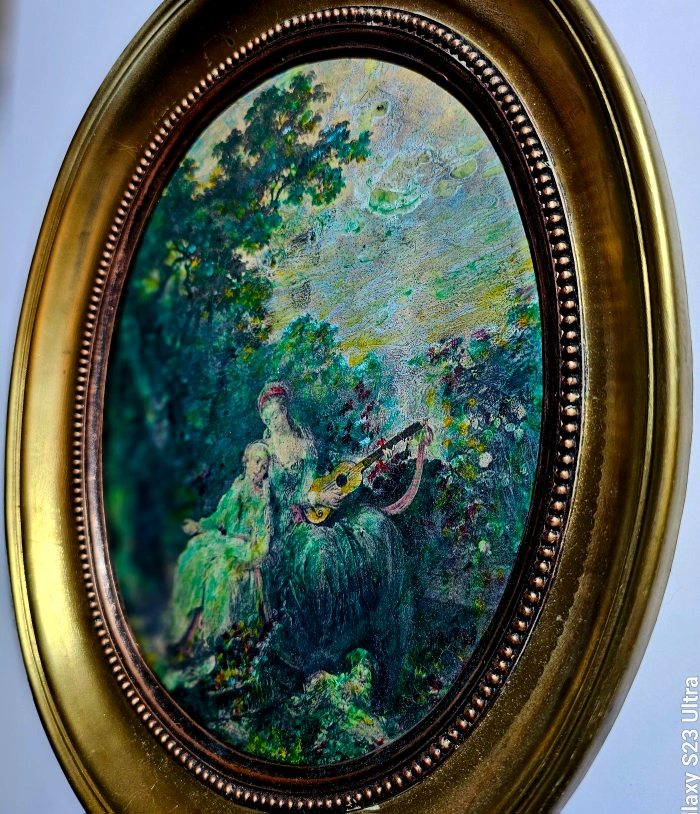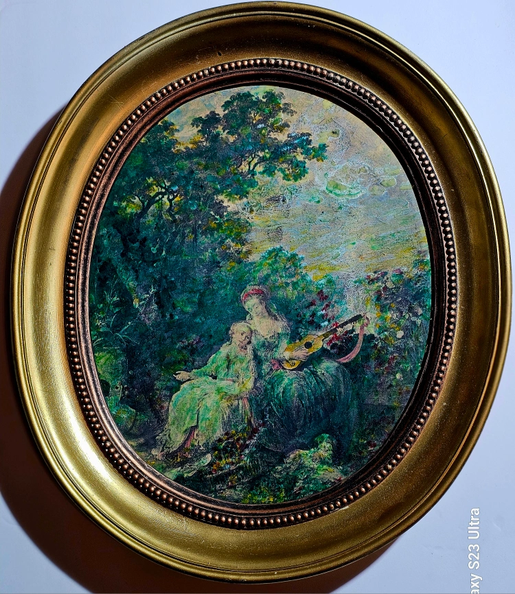 Selling a vintage oval framed original painting. The frame is gold and the painting depicts two figures in a garden setting. It's a beautiful piece to add some vintage charm to your home!