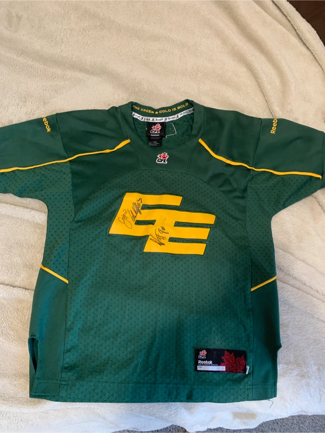 Selling a Reebok CFL Edmonton Elks jersey. It's in great condition and features the classic green and gold colours. A perfect piece for any CFL fan!