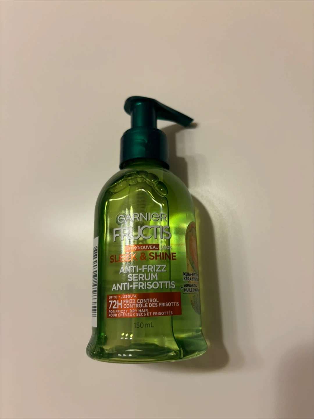 Selling a full bottle of Garnier Fructis Sleek & Shine Anti-Frizz Serum! It's designed to control frizz for up to 72 hours and is great for dry hair. The bottle contains 150 mL of serum, perfect for keeping your hair smooth and sleek!